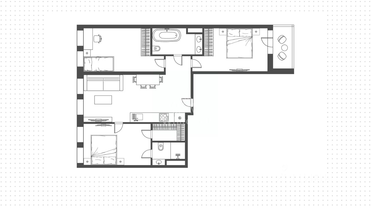 Квартира без отделки общей площадью 143 м² расположена на восьмом этаже. Планировка позволяет организовать пространство по своему усмотрению. Возможная планировка: кухня-гостиная, мастер-спальня со своим санузлом и гардеробной, две спальни, ванная комната и балкон. Окна ориентированы на две стороны, открываются виды на благоустроенную территорию комплекса.