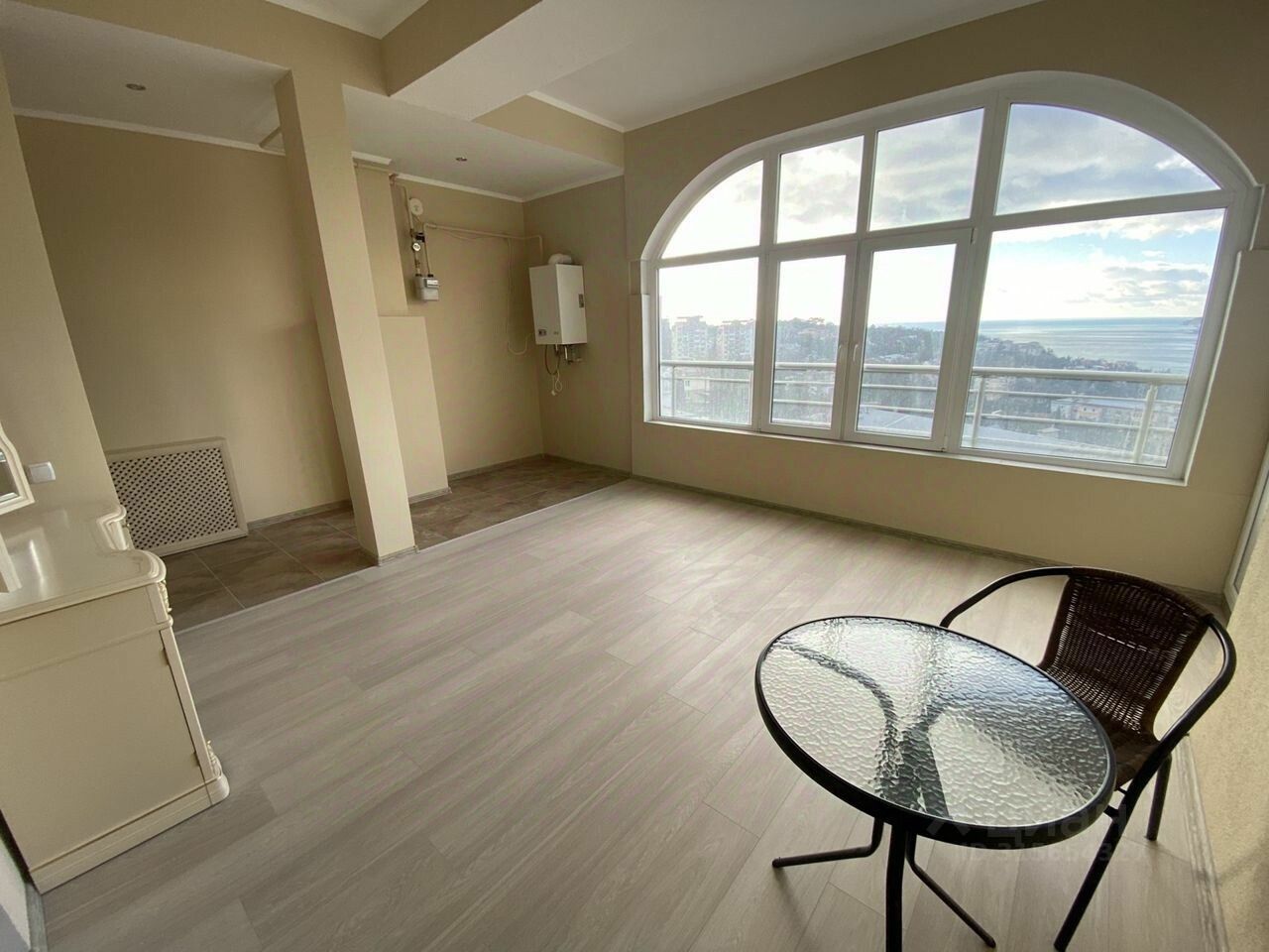 с шикарным видом на всю Ялту, а так же в спальню 14,9 м². Так же имеется застеклённая лоджия 20,8 м². с отоплением и ремонтом! В прихожей есть ниша для гардероба.