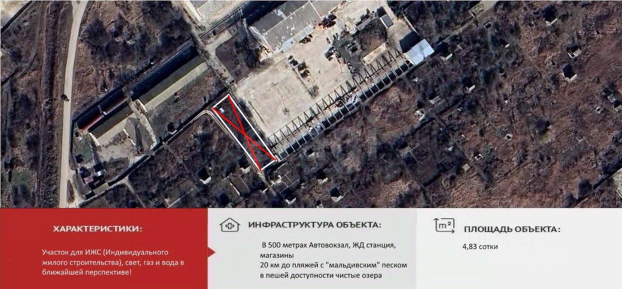 Участок ровной прямоугольной формы, общей площадью 4,83 сотки. Угловой, подъезные пути асфальтированы, в перспективе будет проведен свет, газ, водопровод.