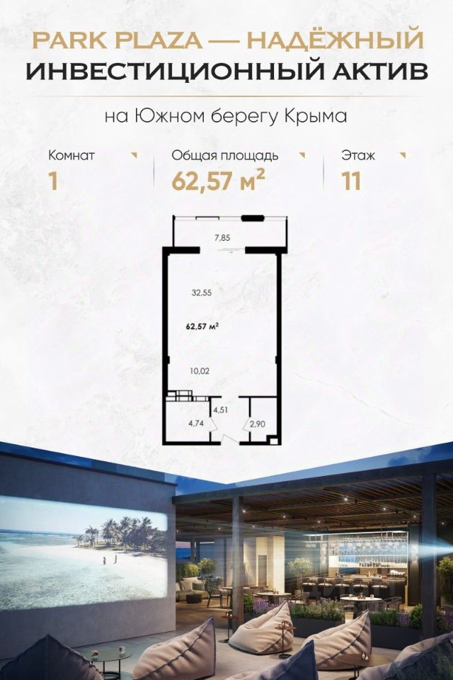 Комплекс Park Plaza расположен в престижном районе Алушты — в Приморском парке, в 150 метрах от пляжа. Это современный клубный дом с закрытой территорией, продуманной инфраструктурой и высоким уровнем сервиса. Преимущества для инвестора Доходность от 30% годовых Собственная сервисная компания: сдача в аренду, клининг, трансферы, управление объектом Формат ''купил — и получаешь доход'': никакой рутины 100% апартаментов с видами на море, парк или горы Беспроцентная рассрочка до сдачи (4 квартал 2025 г.) ФЗ-214, эскроу-счета — безопасность сделки гарантирована Что внутри — Панорамные окна, высокие потолки, балконы и террасы — Гибкие планировки: от однокомнатных до просторных трёхкомнатных и юнитов под деление — Предчистовая отделка: вы сами выбираете стиль интерьера Инфраструктура комплекса — Подземный паркинг с лифтом — Панорамная терраса 1000 м² с лаундж-зонами, SPA, джакузи, йогой и летним кинотеатром — Тренажёрный зал, ресторан, детская игровая, химчистка — Безопасность 24/7, видеонаблюдение, электронные ключи Локация — центр курортной жизни — Приморский парк — 10 метров — Море и пляжи — 150 метров — Набережная и рестораны — 3 минуты пешком — Спортивный центр сборных команд РФ — 200 метров — До Ялты — 30 минут, до Крымского моста — 3,5 часа Почему выбирают Park Plaza: — Умеренная конкуренция — ограниченное предложение премиального сегмента в Алуште — Локация работает на вас — туристический спрос растёт ежегодно — Можно совмещать личный отдых и аренду — all inclusive-сервис это позволяет — Рассрочка до конца строительства — без банков и процентов Успейте купить до роста цен — первый этап продаж уже стартовал. Оставьте заявку — отправим вам: Портфель с планировками и ценами Инвестиционный расчёт с окупаемостью Презентацию с визуализациями и ответами на частые вопросы Park Plaza — место, где отдых превращается в доход. Для жизни. Для пенсии. Для капитала.