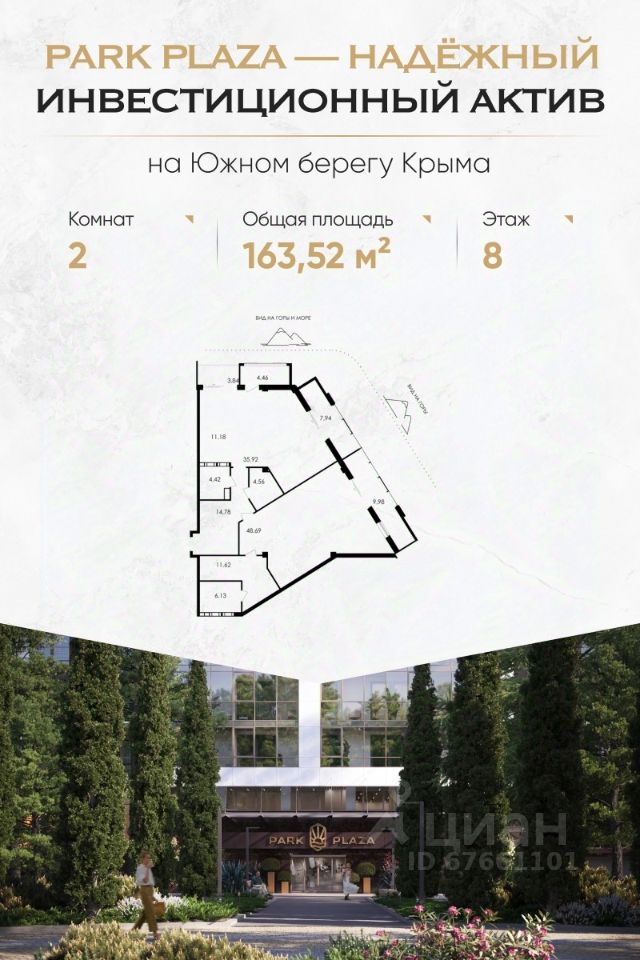 Комплекс Park Plaza расположен в престижном районе Алушты — в Приморском парке, в 150 метрах от пляжа. Это современный клубный дом с закрытой территорией, продуманной инфраструктурой и высоким уровнем сервиса. Преимущества для инвестора Доходность от 30% годовых Собственная сервисная компания: сдача в аренду, клининг, трансферы, управление объектом Формат ''купил — и получаешь доход'': никакой рутины 100% апартаментов с видами на море, парк или горы Беспроцентная рассрочка до сдачи (4 квартал 2025 г.) ФЗ-214, эскроу-счета — безопасность сделки гарантирована Что внутри — Панорамные окна, высокие потолки, балконы и террасы — Гибкие планировки: от однокомнатных до просторных трёхкомнатных и юнитов под деление — Предчистовая отделка: вы сами выбираете стиль интерьера Инфраструктура комплекса — Подземный паркинг с лифтом — Панорамная терраса 1000 м² с лаундж-зонами, SPA, джакузи, йогой и летним кинотеатром — Тренажёрный зал, ресторан, детская игровая, химчистка — Безопасность 24/7, видеонаблюдение, электронные ключи Локация — центр курортной жизни — Приморский парк — 10 метров — Море и пляжи — 150 метров — Набережная и рестораны — 3 минуты пешком — Спортивный центр сборных команд РФ — 200 метров — До Ялты — 30 минут, до Крымского моста — 3,5 часа Почему выбирают Park Plaza: — Умеренная конкуренция — ограниченное предложение премиального сегмента в Алуште — Локация работает на вас — туристический спрос растёт ежегодно — Можно совмещать личный отдых и аренду — all inclusive-сервис это позволяет — Рассрочка до конца строительства — без банков и процентов Успейте купить до роста цен — первый этап продаж уже стартовал. Оставьте заявку — отправим вам: Портфель с планировками и ценами Инвестиционный расчёт с окупаемостью Презентацию с визуализациями и ответами на частые вопросы Park Plaza — место, где отдых превращается в доход. Для жизни. Для пенсии. Для капитала.