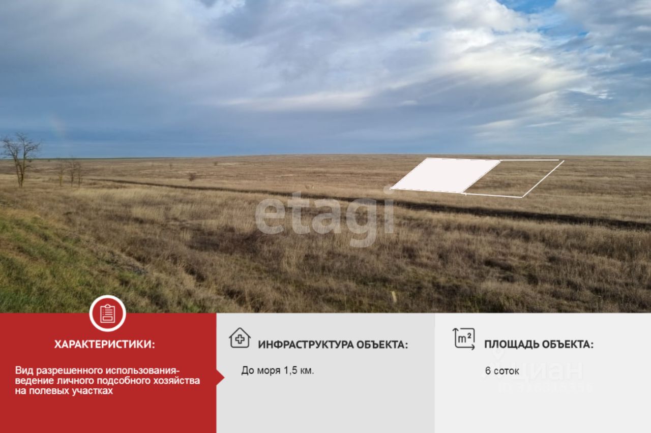 Недалеко от моря, на территории Молочненского сельского совета. Категория земель: ЛПХ . Разрешённое использование: Ведение личного подсобного хозяйства на полевых участках. Участок ровный, правильной формы.
