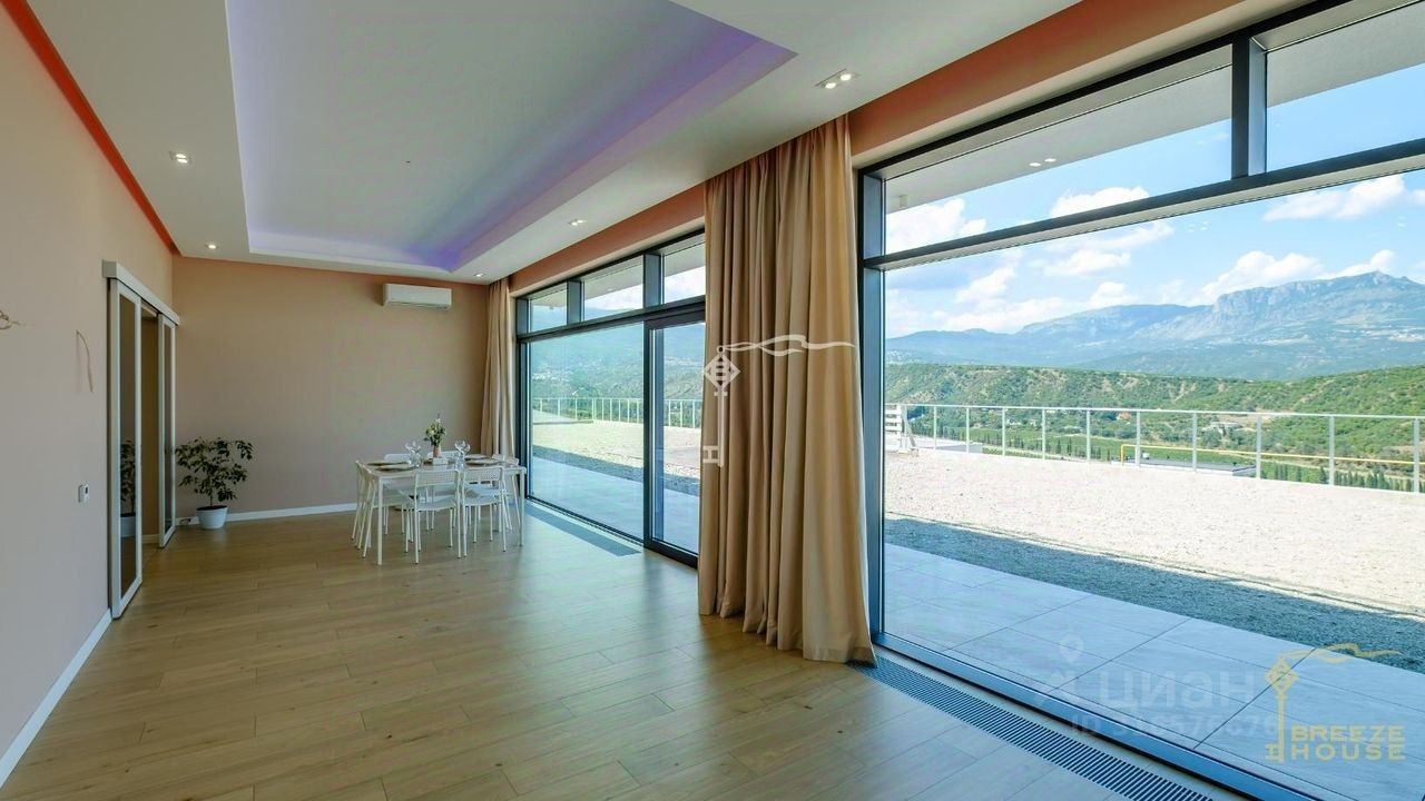 Предлагается к продаже современный коттедж с панорамным остеклением и шикарным видом на место силы - гору Демерджи и Черное море. Коттедж расположен в спальном районе Алушты на участке 5,5 соток. Есть открытый бассейн.