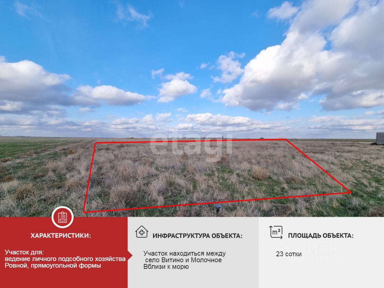 Продается участок 23.41 сотки, ЛПХ, между с. Молочное и с. Витино, непосредственно вблизи моря.