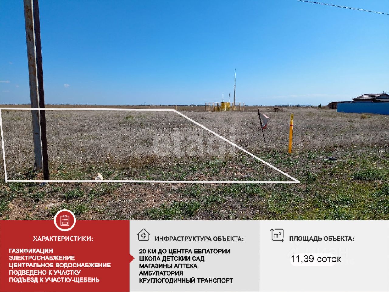 Площадь участка 11.39 соток, правильной прямоугольной формы. Категория земель: земли населенных пунктов, Вид разрешенного использования: для индивидуального жилищного строительства. Участок расположен в черте поселка. Коммуникации: свет и газ находятся на границе участка. Центральное водоснабжение.