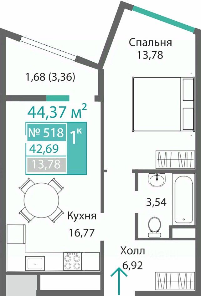 Общая площадь42,69 м2