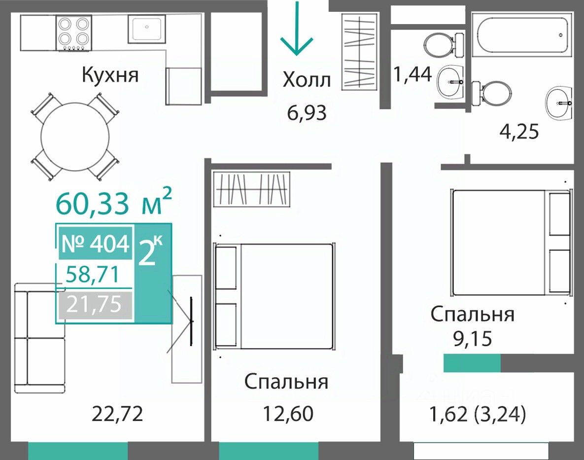 Общая площадь58,71 м2