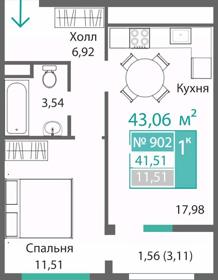 Общая площадь41,51 м2