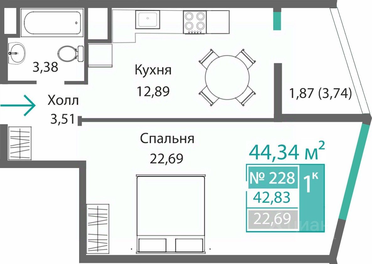 Общая площадь44,34 м2