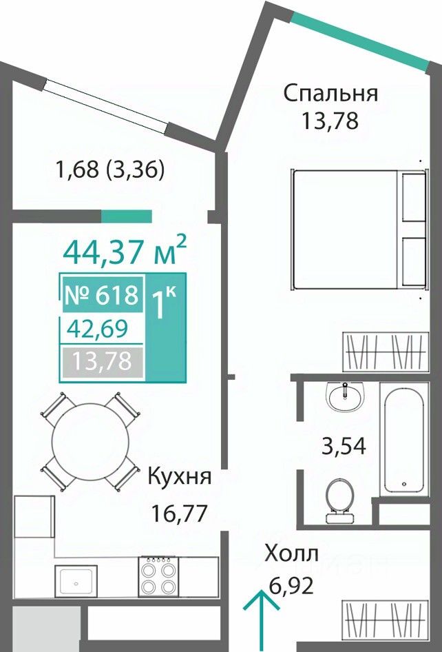 Общая площадь42,69 м2