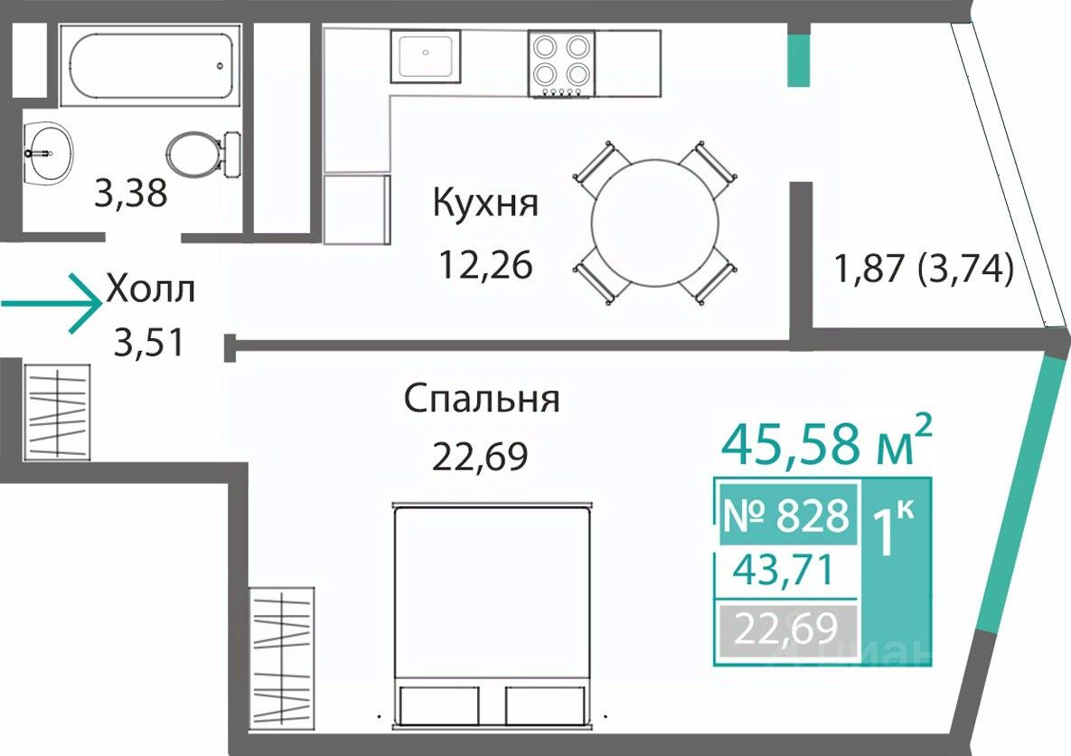 Общая площадь43,71 м2