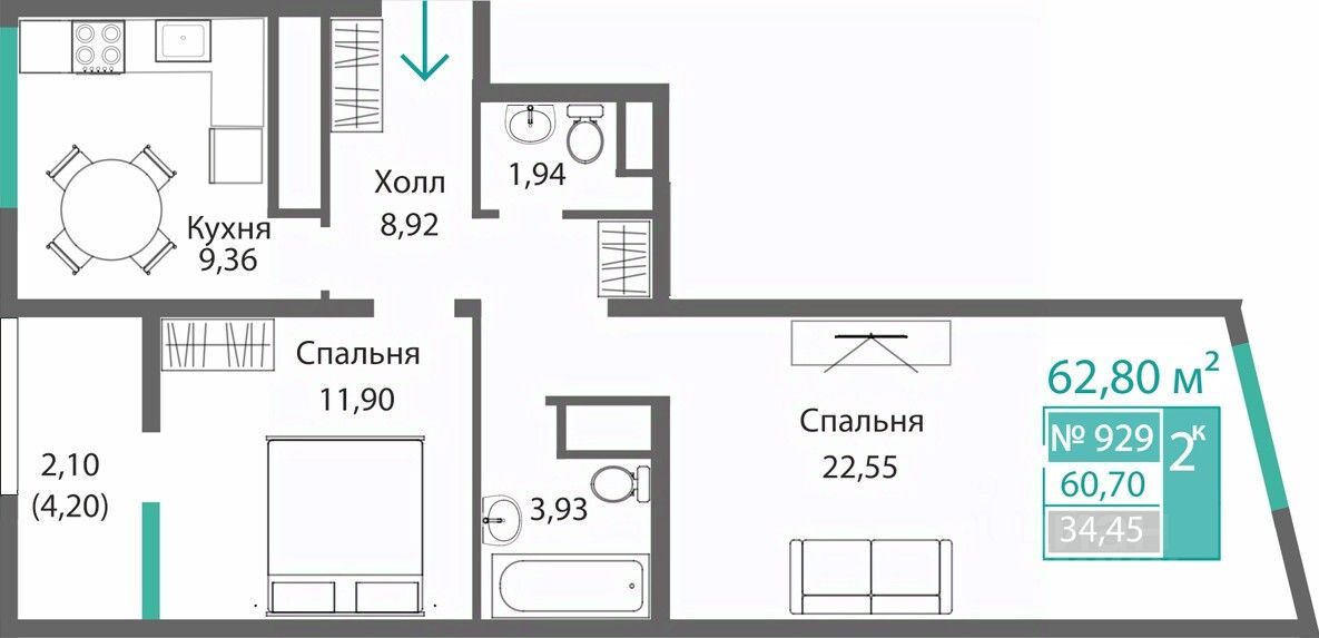 Общая площадь60,7 м2