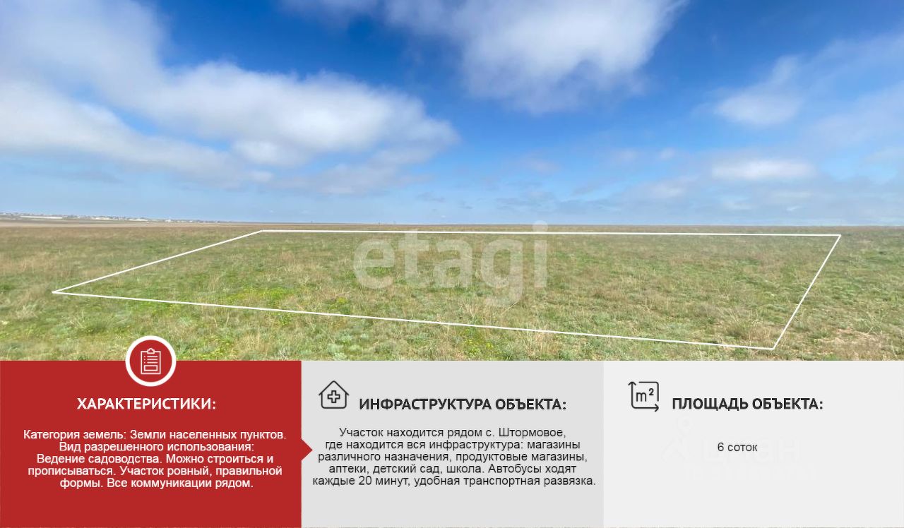 Участок находится рядом с. Штормовое, где находится вся инфраструктура: магазины различного назначения, продуктовые магазины, аптеки, детский сад, школа. Автобусы ходят каждые 20 минут, удобная транспортная развязка.