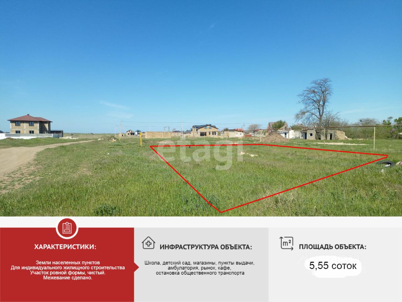 Участок находится на границе с микрорайоном Исмаил-бей. в 100 метрах уже уложен асфальт. Находится в перспективном, активно развивающемся микрорайоне. Рядом находятся д/сад, школа, рынок, магазины, аптека, амбулатория, строительные магазины, оптовый рынок Привоз, все рядом. Автобусная остановка находится в пределах 500 метров. Хорошая транспортная развязка прямой выезд на трассу Симферополь Евпатория Мирный.