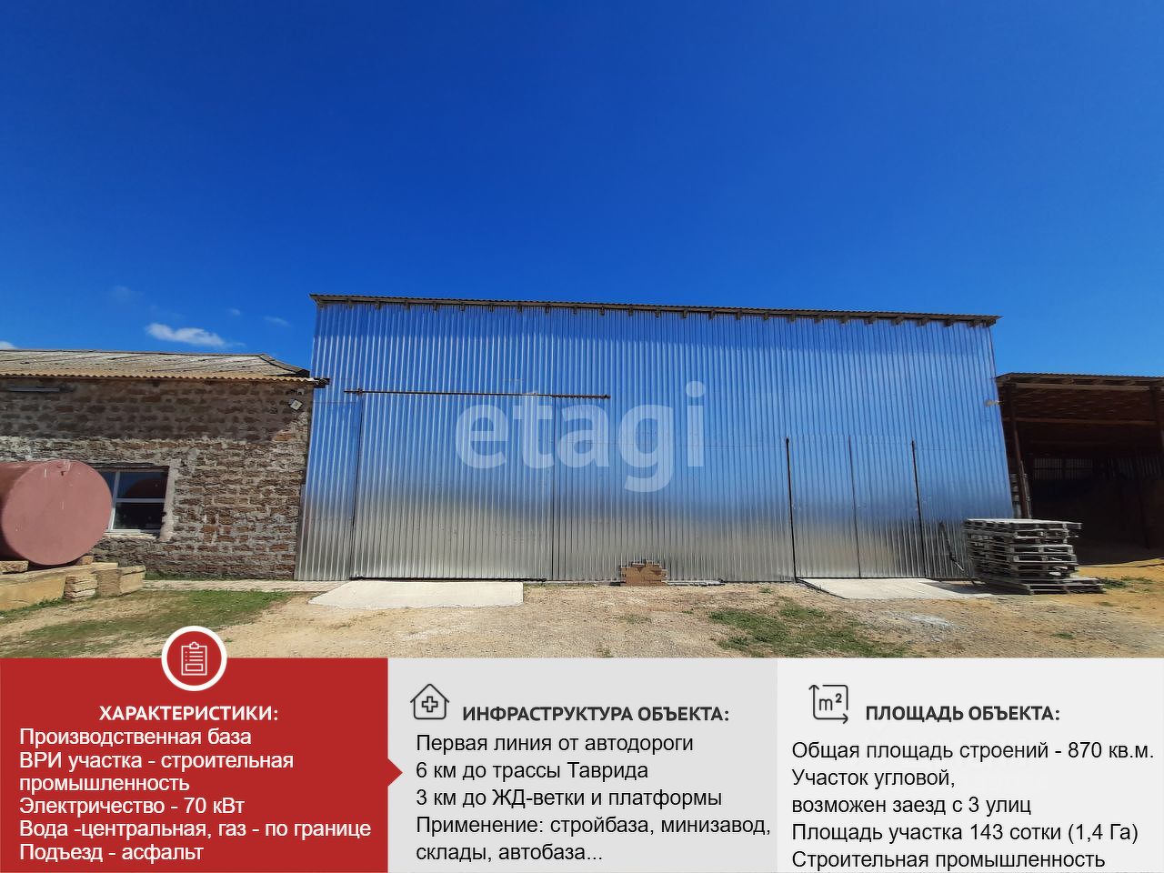 Строительная база с общей площадью построек 870 кв.м. Располагается на угловом участке площадью 143 сотки (1,4 Га) в поселке Рунное Сакского района!