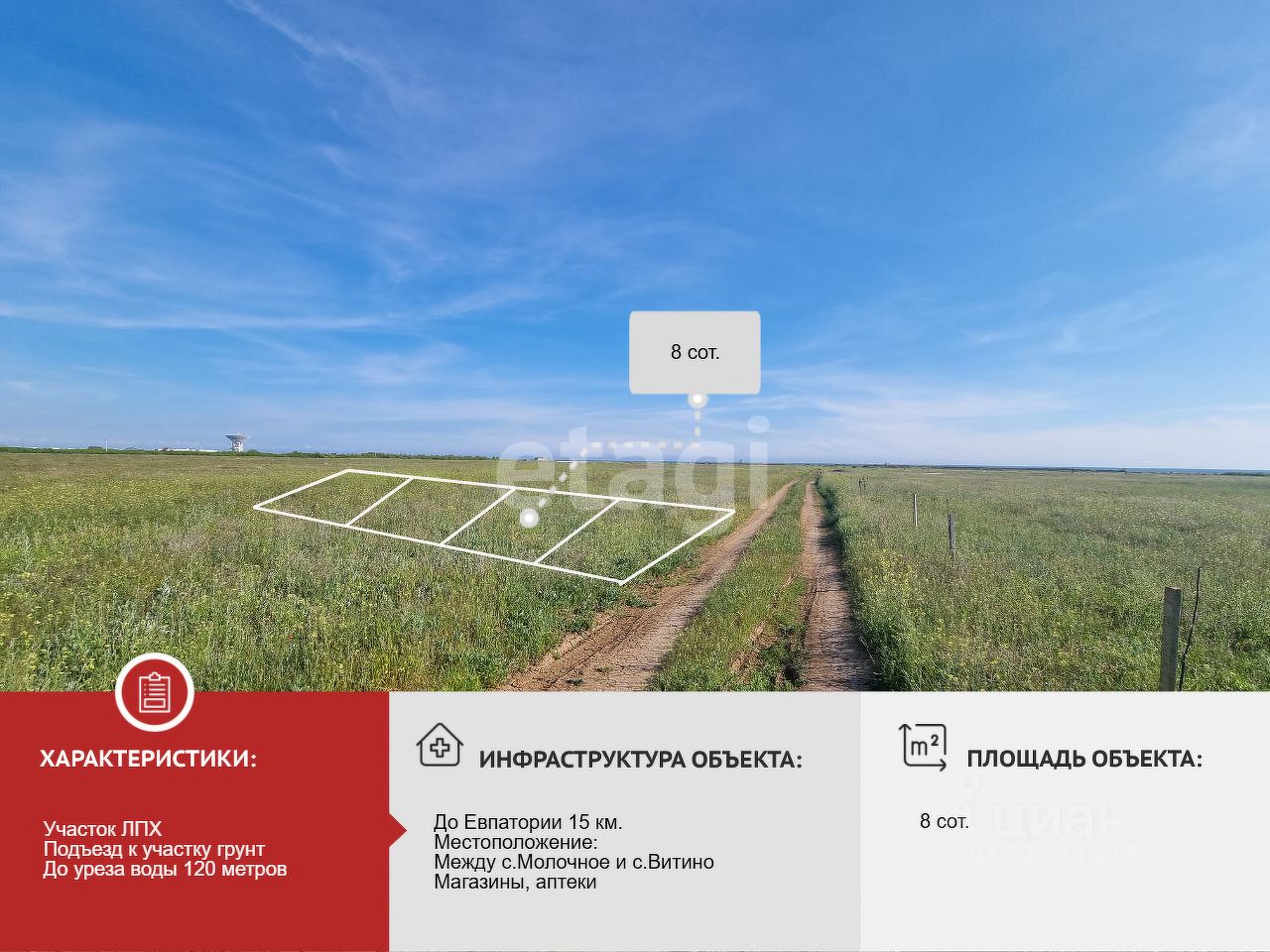 Продается уникальный участок 8 соток ЛПХ в Молочненское сельское поселение, Сакский район, Республика Крым рядом с Евпаторией, ровный, недалеко от моря, на территории Молочненского сельского совета.