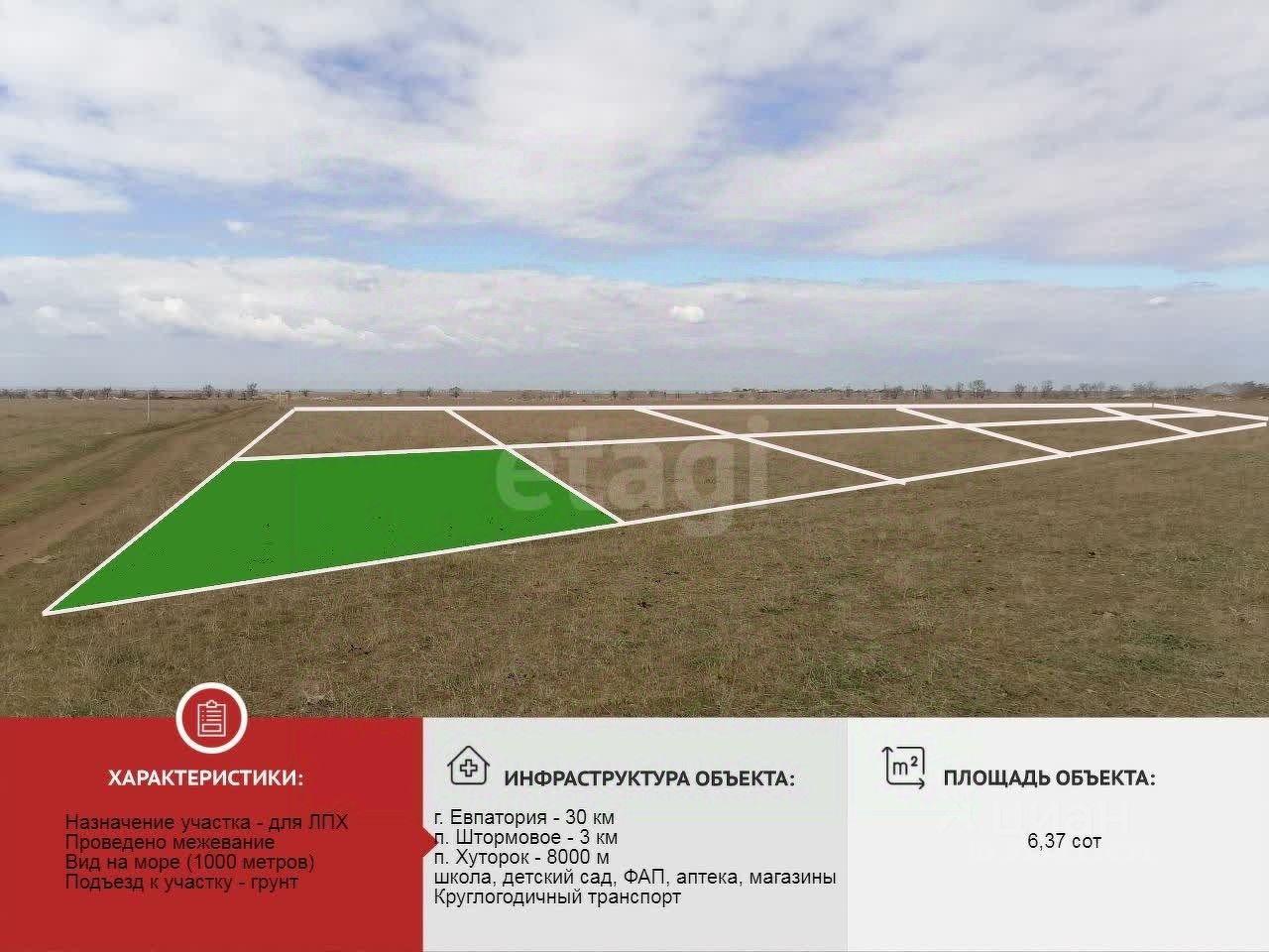 Продается участок 6,37 соток, недалеко от моря, между п. Хуторок и п. Штормовое. Участок ровный, правильной прямоугольной формы, не огорожен по периметру. Категория земли - земли сельскохозяйственного назначения, вид разрешенного использования - для ведения личного подсобного хозяйства на полевых участках. От участка до моря 1000 метров, до п. Хуторок - 800 метров, до п. Штормовое - 3 км., г. Евпатория - 30 км. В этой локации, как и почти везде в северо-западном Крыму, замечательные песчаные пляжи, доступные для всех категорий отдыхающих. Документы РФ. Звоните, отвечу на все интересующие вопросы.