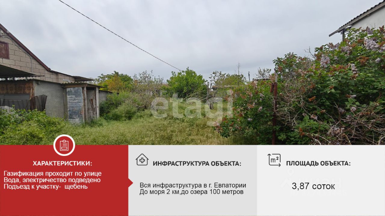 Участок находиться в черте города Евпатории, категория земли: земли населенных пунктов.Вид разрешенного использования: ведение садоводства. Вся инфраструктура в городе Евпатории.До моря два км, до озера 100 метров.