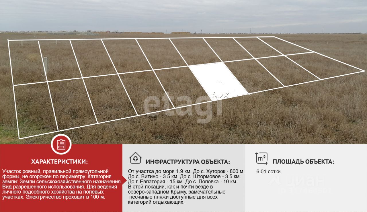 От участка до моря 1.9 км. До с. Хуторок - 800 м. До с. Витино - 3.5 км. До с. Штормовое - 3.5 км. До г. Евпатория - 15 км. До с. Поповка - 10 км. В этой локации, как и почти везде в северо-западном Крыму, замечательные песчаные пляжи доступные для всех категорий отдыхающих.