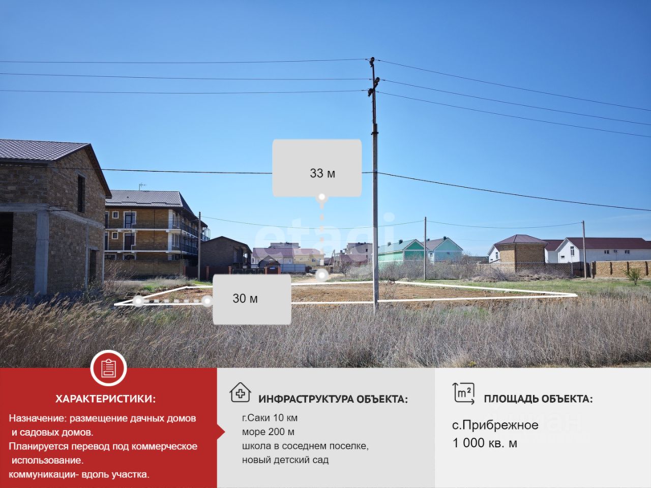 Перспективы этого места впечатляют: район Прибрежного активно развивается, рядом возводится жилой комплекс ''Прибрежный'', что гарантирует рост стоимости вашего актива. До города Саки — всего 5 км, до Евпатории с ее оживленной набережной — 12 км, а до Симферополя — комфортные 50 км по трассе, которая находится всего в 600 метрах от участка.