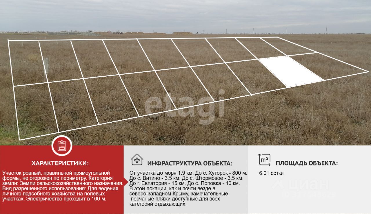 От участка до моря 1.9 км. До с. Хуторок - 800 м. До с. Витино - 3.5 км. До с. Штормовое - 3.5 км. До г. Евпатория - 15 км. До с. Поповка - 10 км. В этой локации, как и почти везде в северо-западном Крыму, замечательные песчаные пляжи доступные для всех категорий отдыхающих.