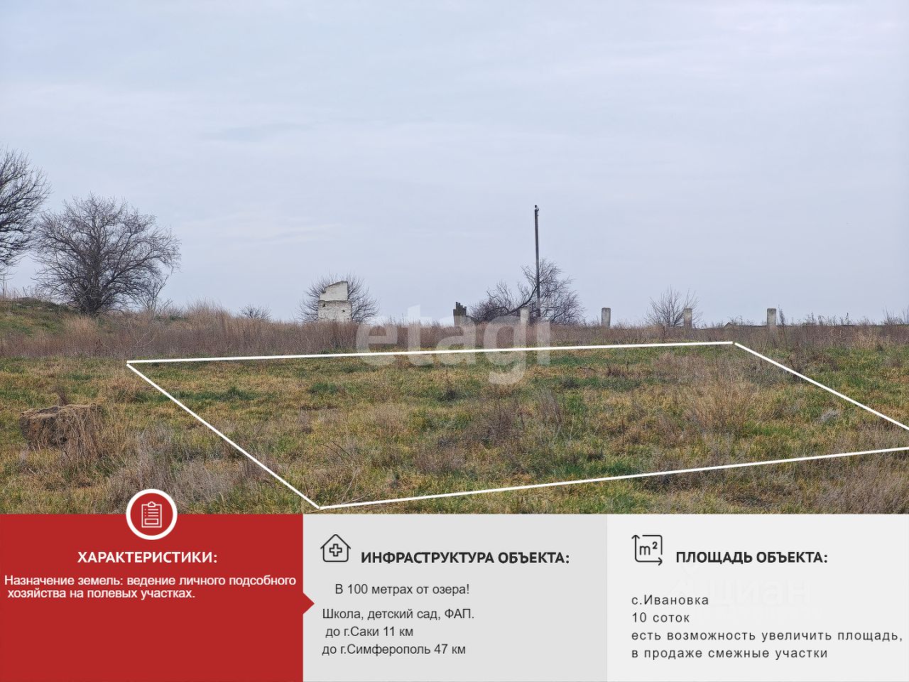 Продам земельный участок площадью 10 соток в Ивановском сельском поселении Сакского района Республики Крым.