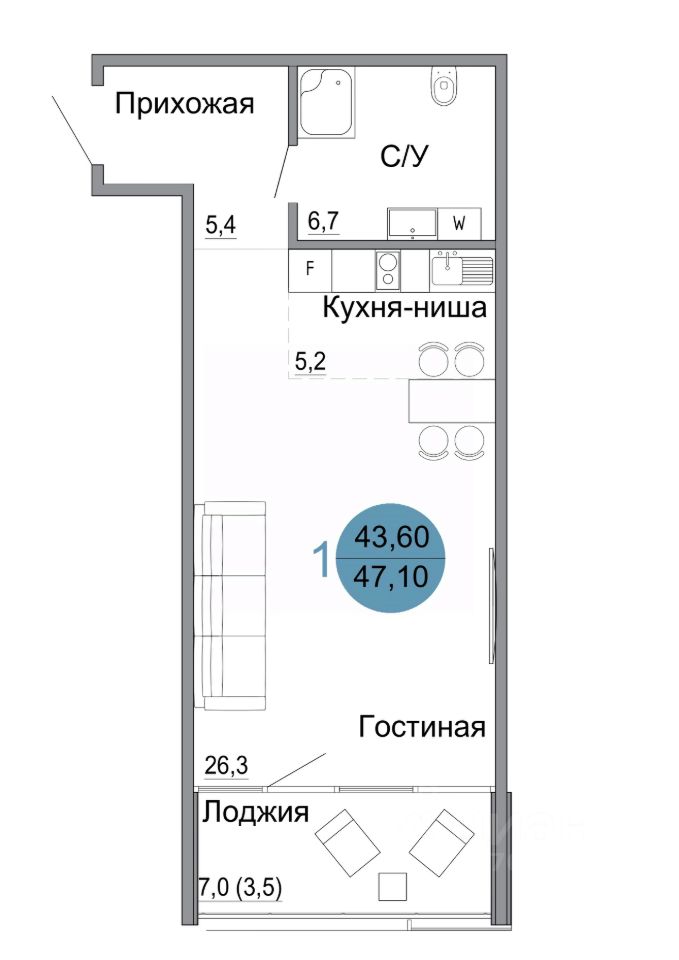 Жилая площадь26,3 м2