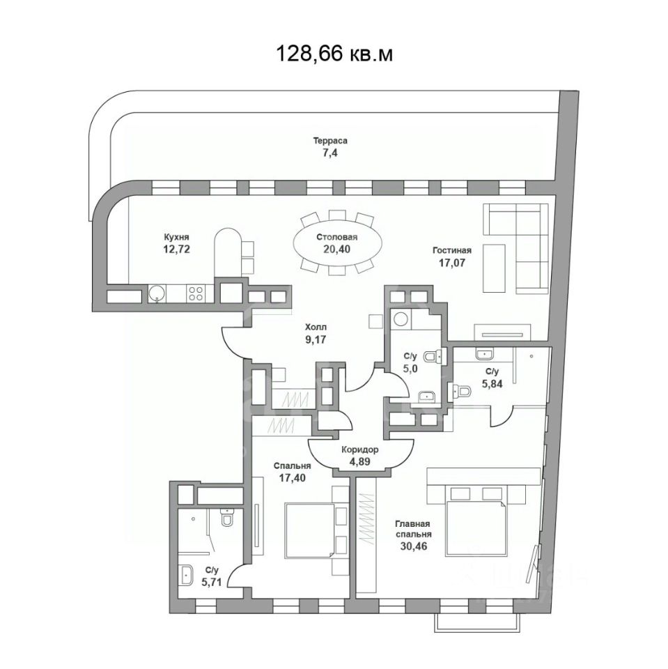 Функциональная планировка: кухня-гостиная, мастер-спальня с собственной ванной, вторая спальня с ванной комнатой и окном, гостевой санузел с постирочным блоком, холл с большим встроенным шкафом.