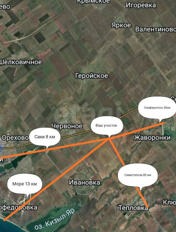 Удобное расположение обеспечивает быстрый доступ к основным транспортным артериям: трасса ЕвпаторияСимферополь проходит всего в 50 метрах, что упрощает выезд в любом направлении. До города Саки — 8 километров, до Симферополя — 50 километров, что делает участок привлекательным как для постоянного проживания с возможностью ведения хозяйства, так и для сезонного использования. Близость к населенным пунктам обеспечивает доступ к необходимой инфраструктуре, включая магазины, медицинские учреждения и образовательные объекты, при этом участок остается в тихой и экологически чистой зоне.