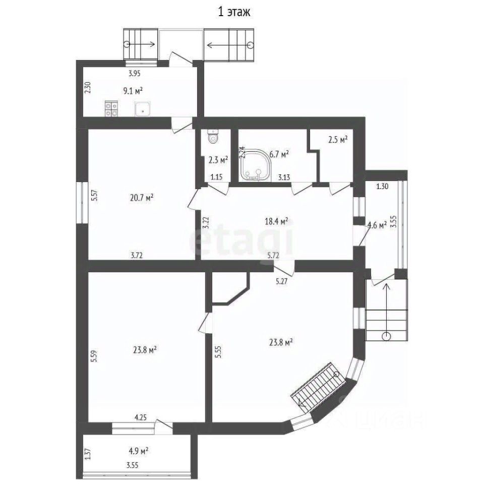 Дом трехэтажный. На первом этаже вместительная прихожая 18,4 квадратных метра, из которой можно попасть в большую столовую и кухню с выходом в прекрасный сад. Железобетонный фундамент, стены из альминского камня, кирпича и ракушечника, перекрытие железобетонные блоки. С другой стороны проход в огромный двухэтажный холл, высотой 5,5 метров, из которого можно попасть в комнату с видовым балконом, площадью 23,8 квадратных метра. На первом этаже расположен санузел и ванная комната с душевой кабиной.
