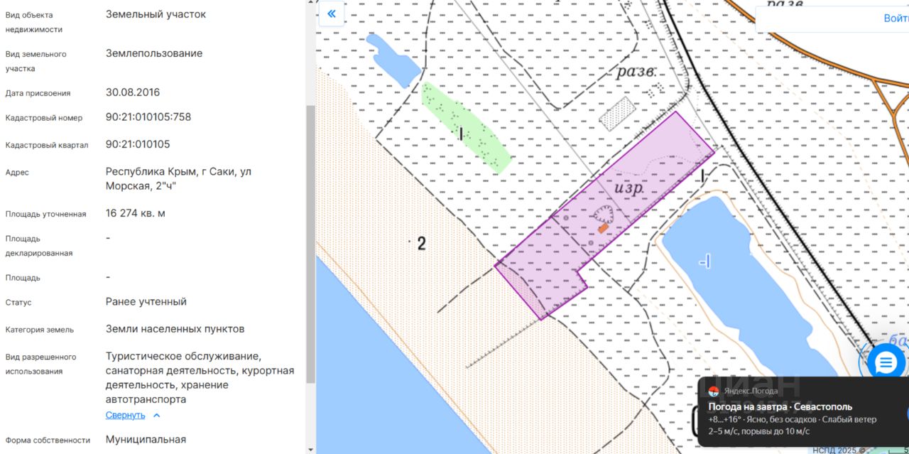 ЗУ - 1.62 га в аренде на 49 лет + 0.38 га пляжная карта. Стоимость аренды 220 000 руб Х 1 месяц (аренда пляжной карты истекла- ВРИ гостиничное обслуживание и медицинская деятельность) можно перезаключить.
