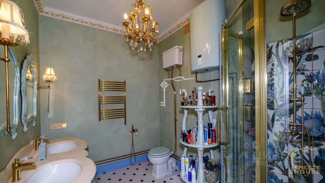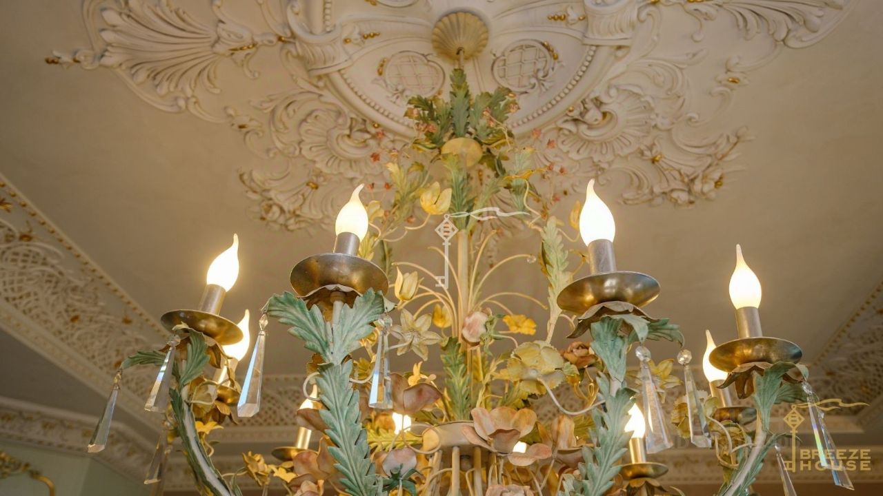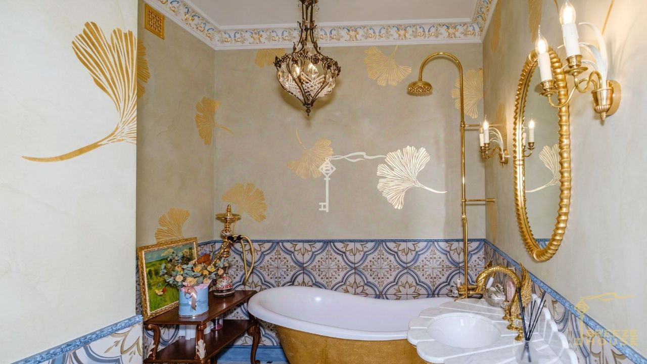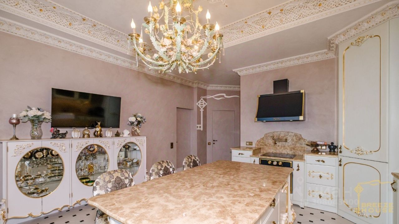 -Потолки украшены изысканной гипсовой лепниной с художественной отделкой, нежным золочением и патинированием, -Стены оформлены премиальной итальянской декоративной штукатуркой и ручной росписью маслом в стиле старинных европейских интерьеров, -На полу - испанская плитка и итальянская паркетная доска.