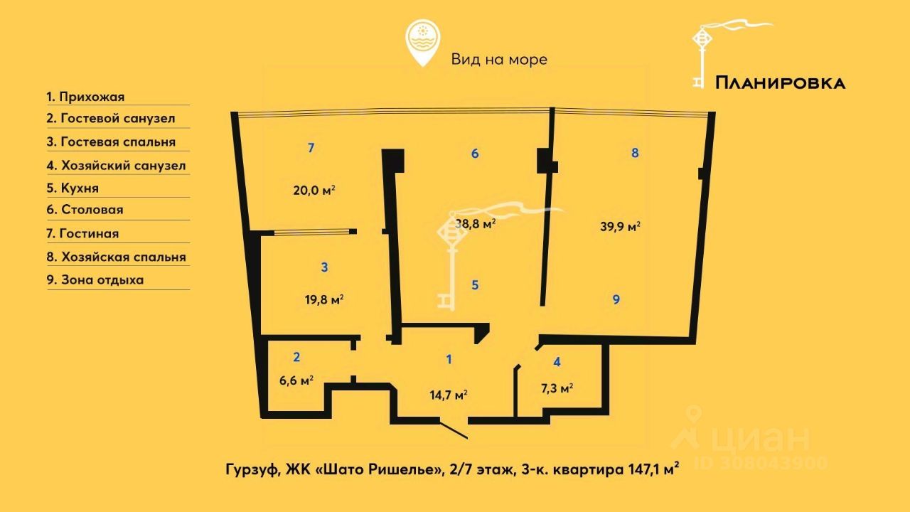 -просторная и светлая кухня-столовая, -гостиная с панорамным видом на море, -изысканная мастер-спальня с зонированной пространством для досуга, -гостевая спальня, -две просторные ванные комнаты, -элегантная прихожая.