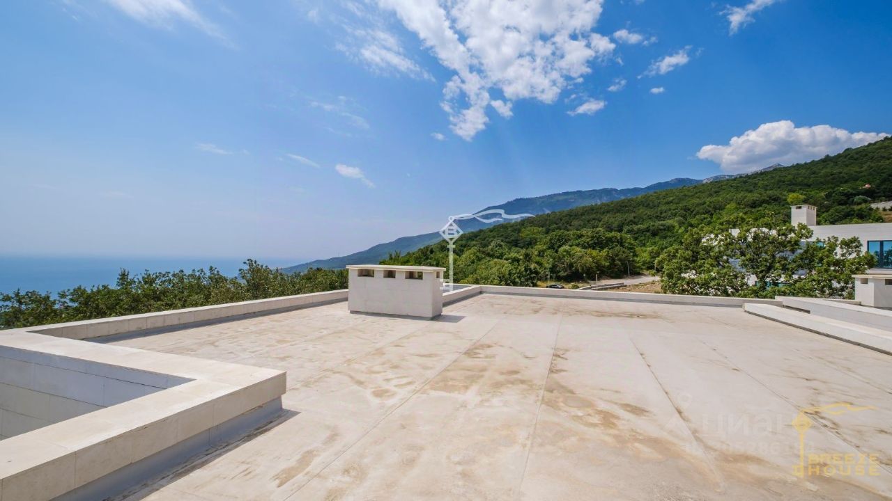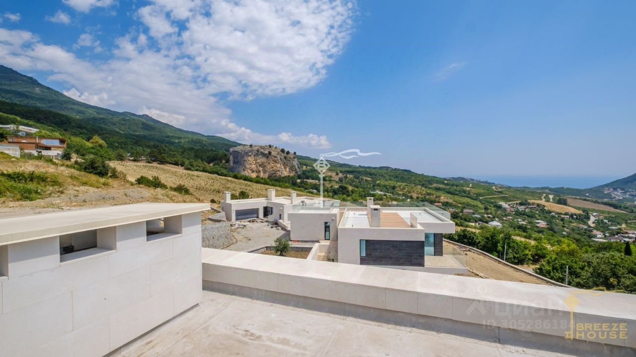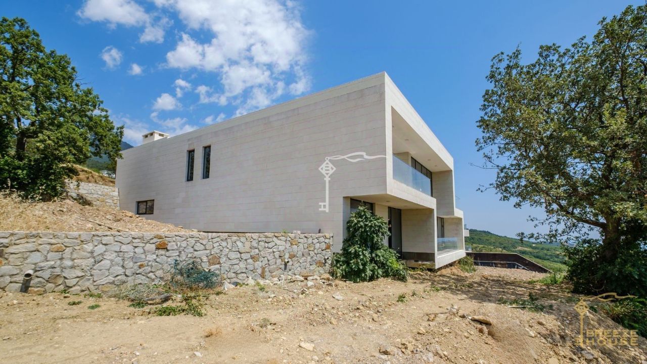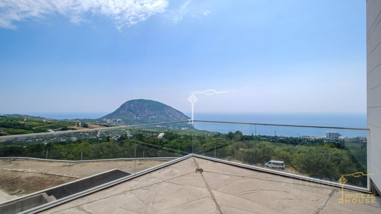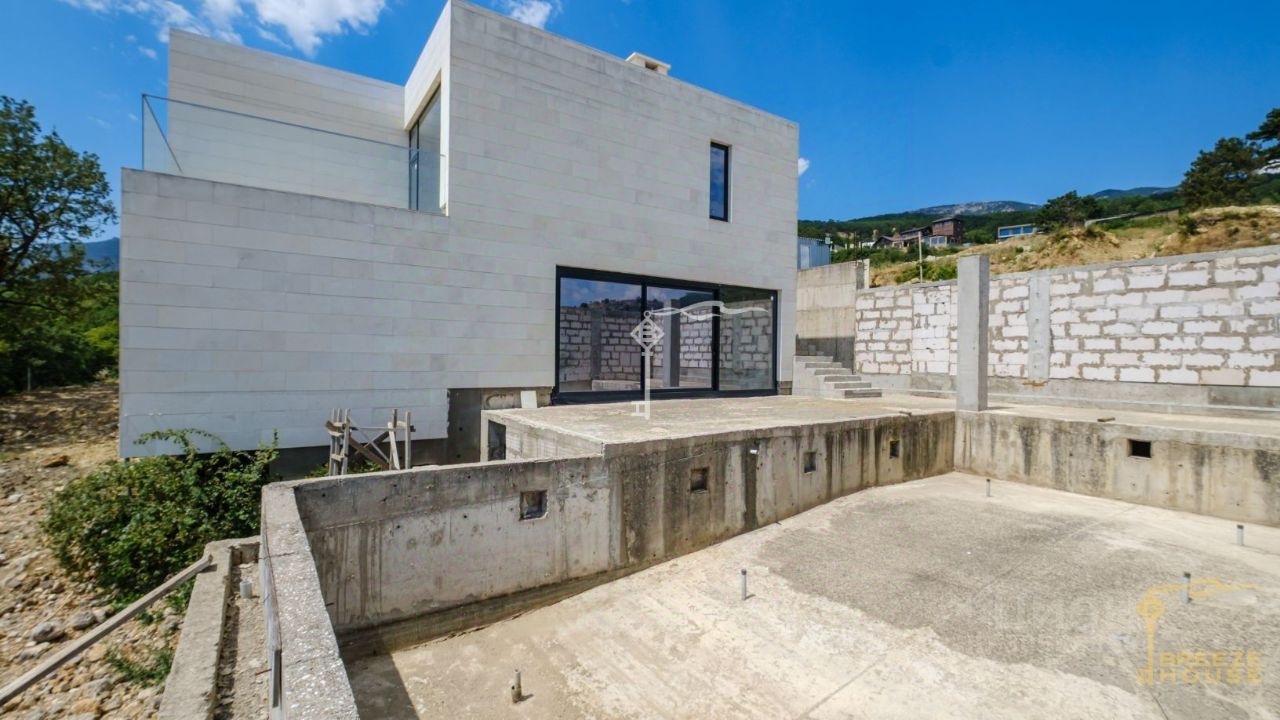 Современная вилла с панорамным остеклением и потрясающим видом на море и Медведь гору, расположенная в коттеджном посёлке премиум-класса в Краснокаменке. Двухэтажная вилла площадью 437 м².