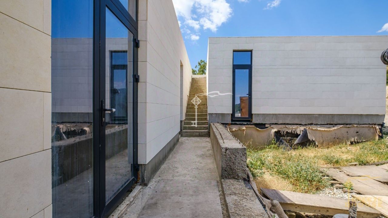 Вилла предлагается без внутренней отделки, однако фасад и входная группа уже завершены. На открытых террасах и лестницах планируется укладка керамогранита. Также произведены работы по планировке участка и возведению подпорных стен.