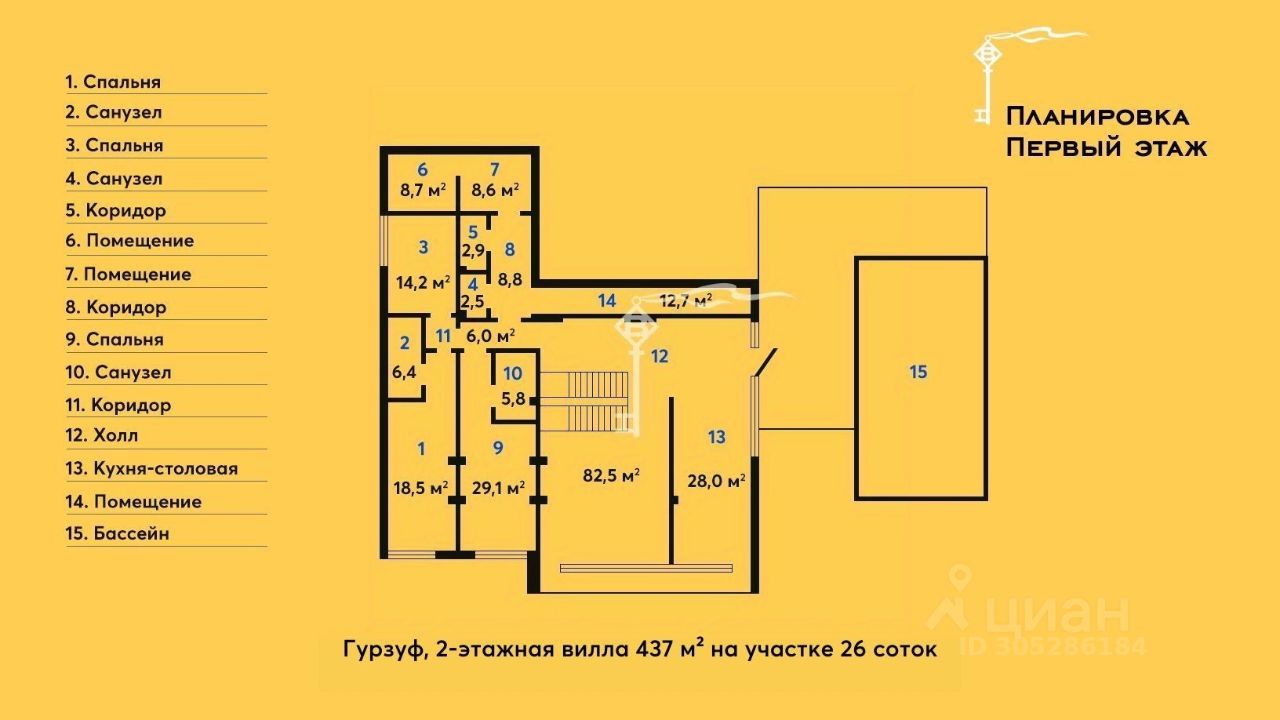 -просторная гостиная с панорамным остеклением и вторым светом, -кухня-столовая с выходом к бассейну, -две спальни с собственными санузлами, -SPA-зона, -технические помещения.