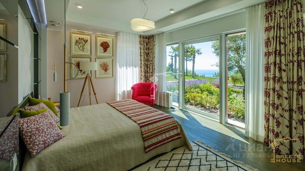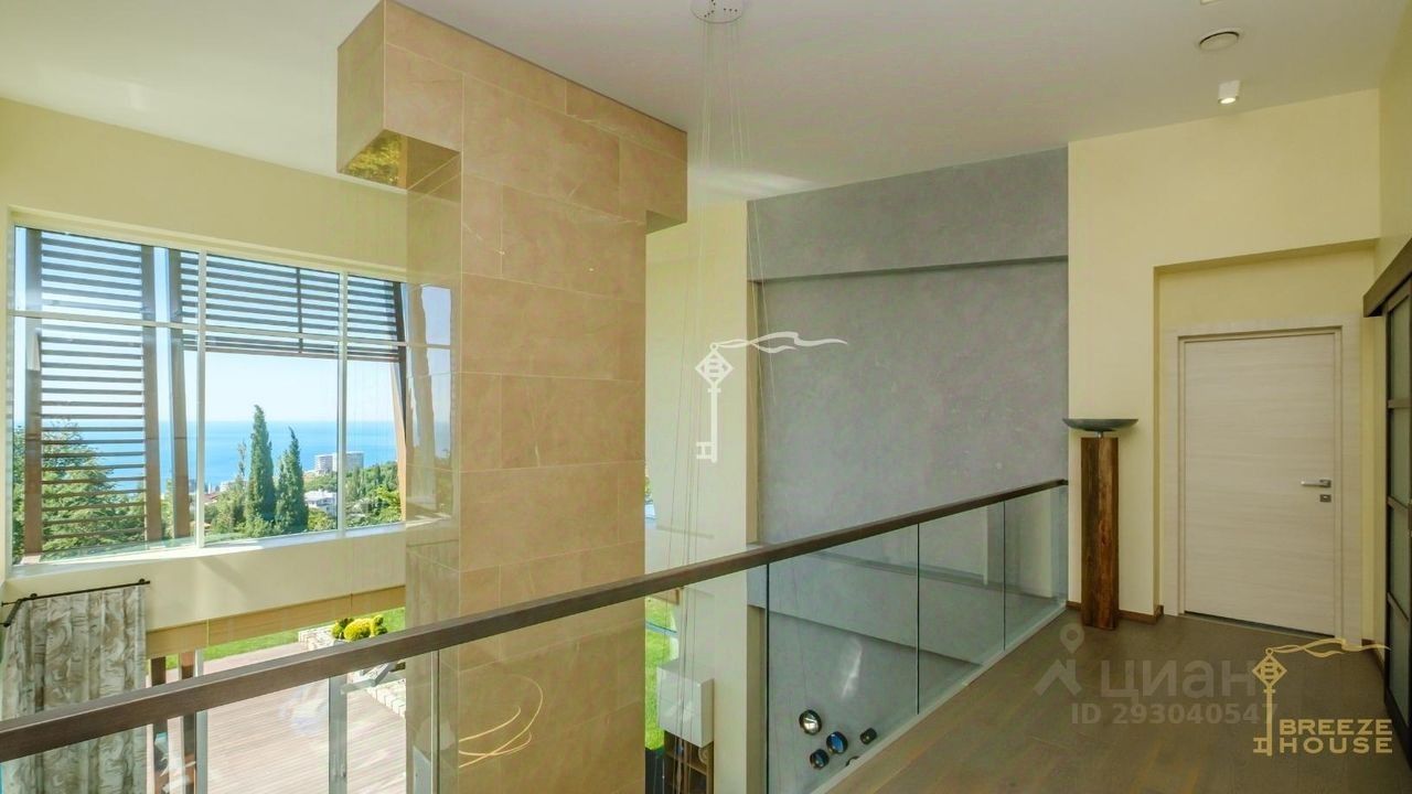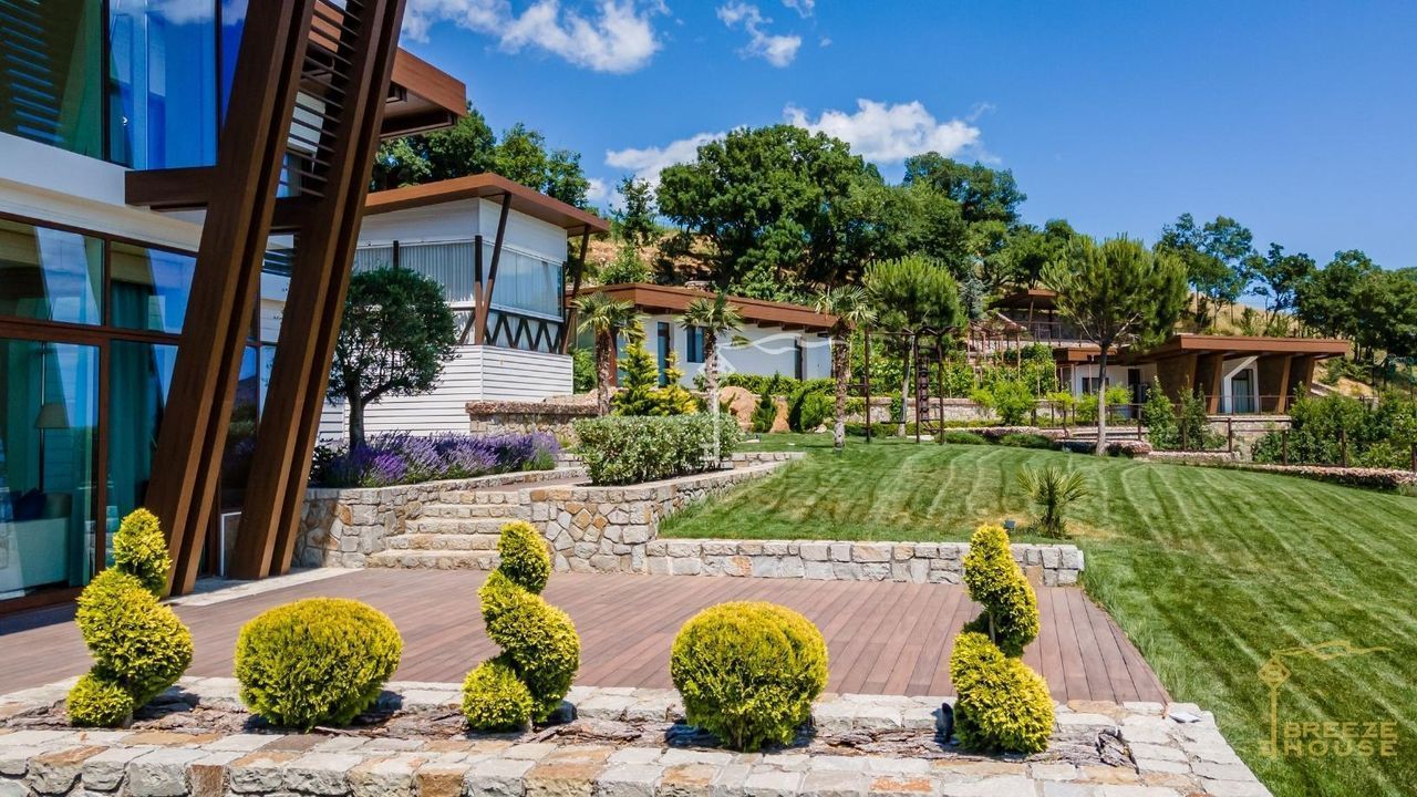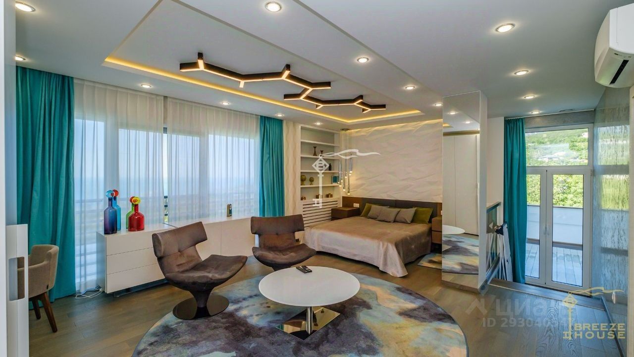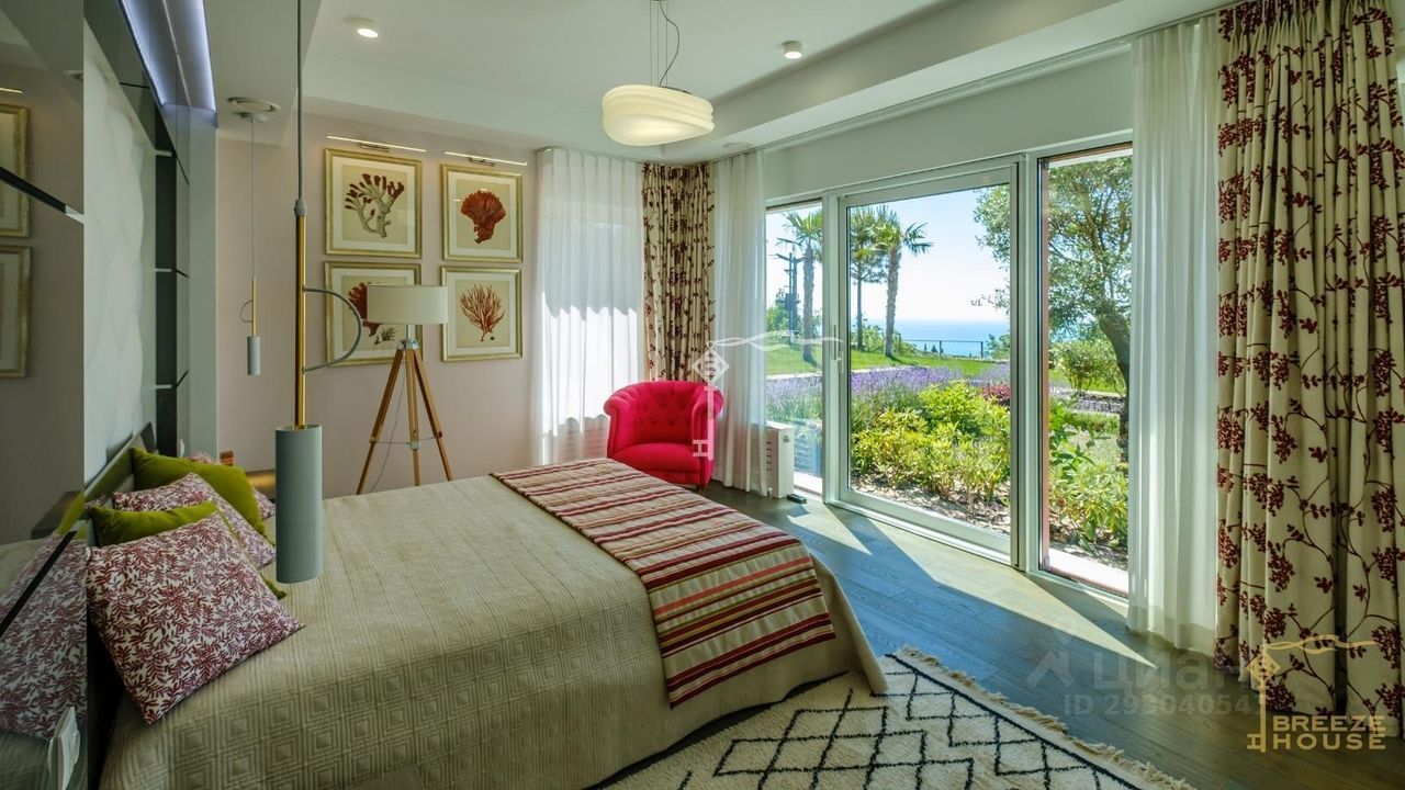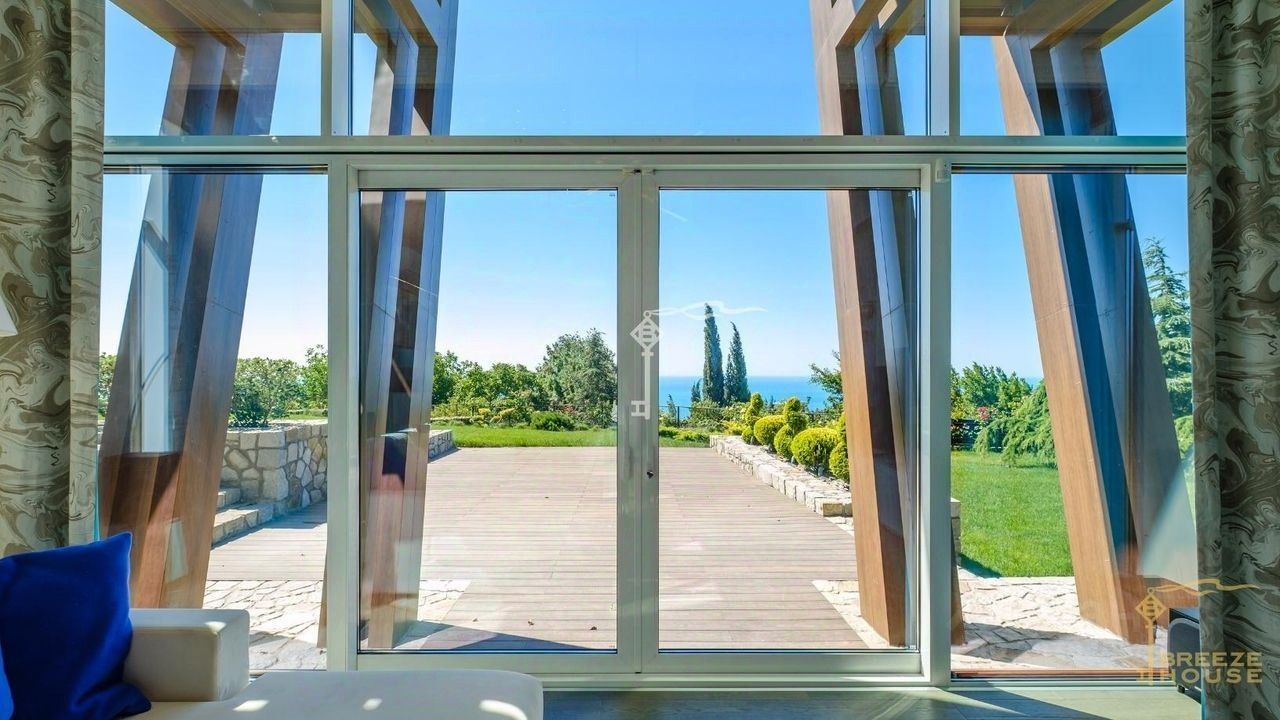 -Гостевои дом 78,6 м² представляет собои две зеркальные квартиры с витражным остеклением в зоне гостинои, дизаин интерьера также выполнен в современном стиле. -Беседку с видом на Черное море и горы. На благоустроенной территории высажены уникальные деревья и растения, завезенные из Италии, сделана система автополива, а также расположены: