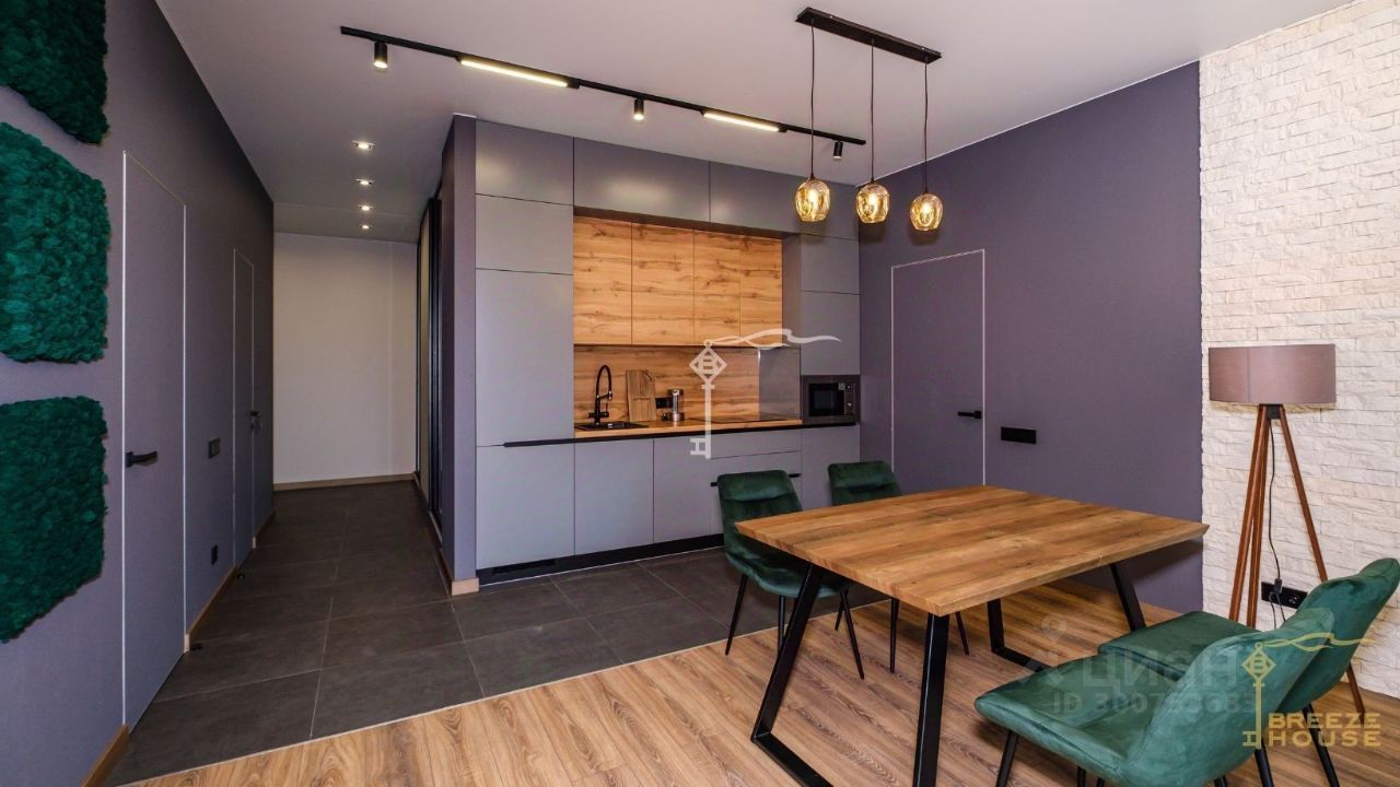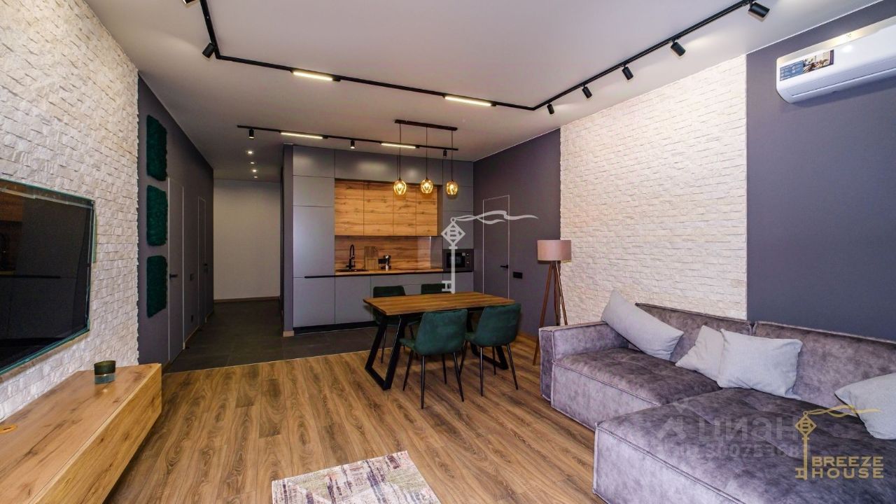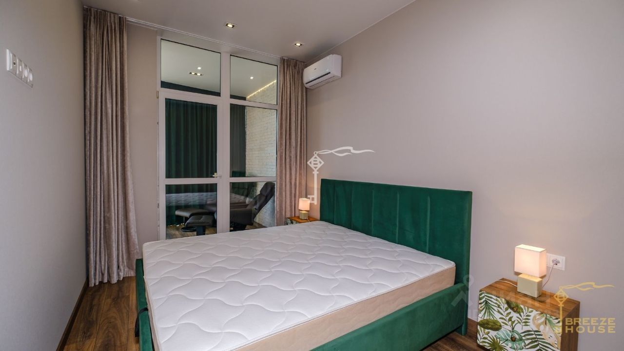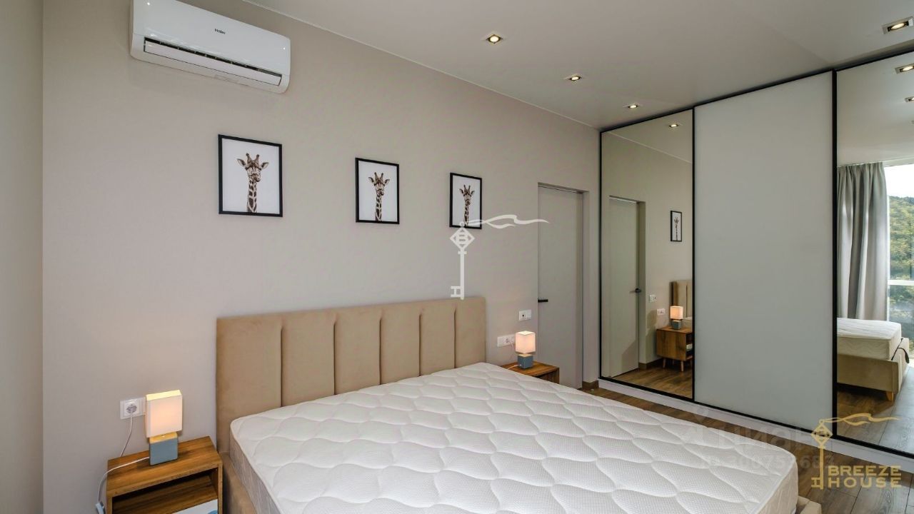 Продажа стильных трехкомнатных апартаментов с качественным дизайнерским ремонтом с двумя спальнями и панорамным видом на море в комплексе ''Южная Пальмира'' в Курпатах.