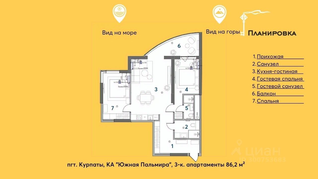 -кухня-гостиная с панорамным остеклением в пол, -две просторные спальни, одна из которых со своим санузлом, -санузел, -прихожая, -балкон с видом на море и горы.