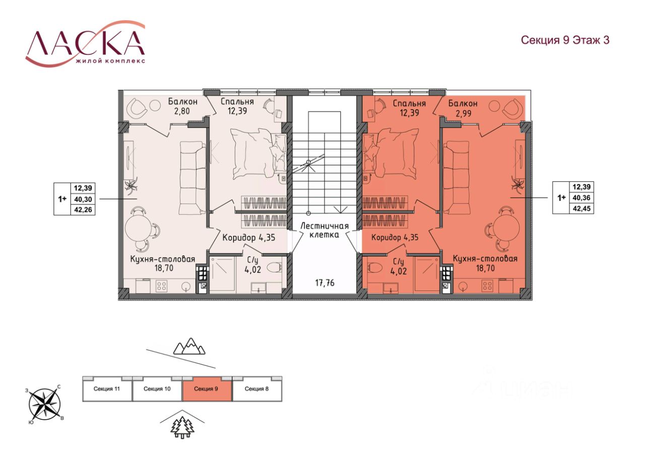 На каждом этаже всего 2 квартиры, что обеспечивает приватность.