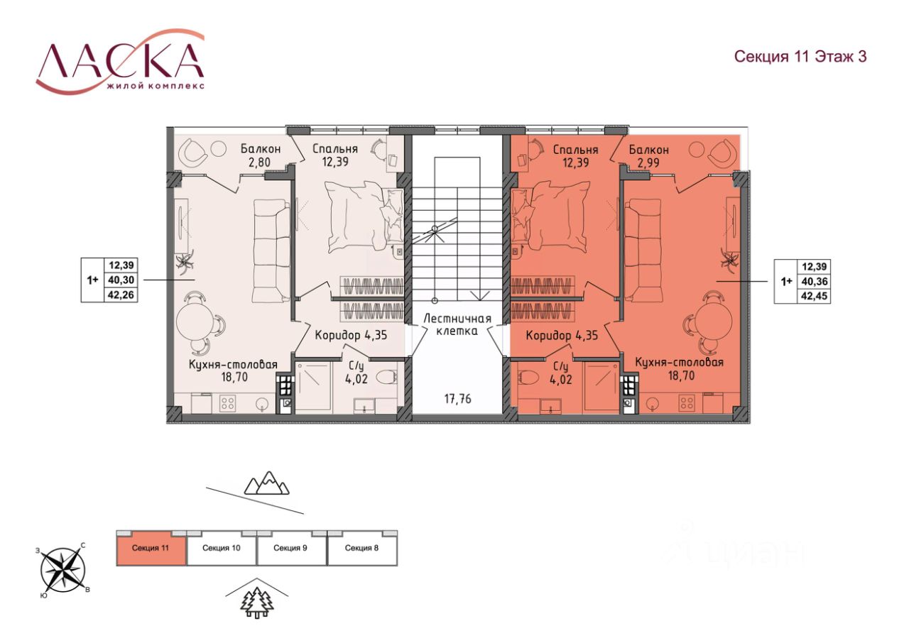 На каждом этаже всего 2 квартиры, что обеспечивает приватность.