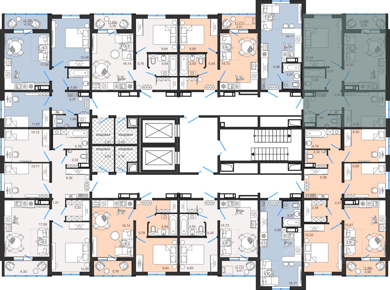 Современные и стильные подъезды с яркими дизайнерскими холлами и качественной отделкой. В каждом подъезде оборудованы просторные колясочные, велосипедные и лапомойки для домашних питомцев. Отдельно вы можете приобрести кладовое помещение на своем этаже для хранения сезонных вещей.