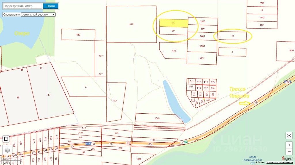 Напротив участка расположено пресное озеро.