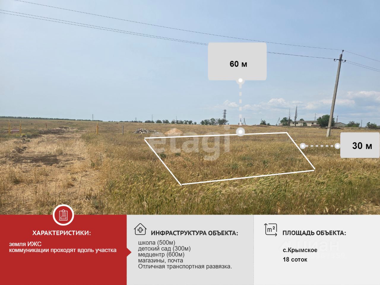Земельный участок площадью 18 соток в селе Крымское Сакского района предназначен для индивидуального жилищного строительства. Участок имеет правильную прямоугольную форму — 30 метров в ширину и 60 метров в длину, что позволяет рационально разместить жилой дом, хозяйственные постройки и зону отдыха. Село Крымское отличается развитой инфраструктурой: в пешей доступности расположены школа (500 м), детский сад (300 м), медицинский центр (600 м), магазины и почта. Транспортная доступность — одно из ключевых преимуществ: регулярные автобусные рейсы связывают село с городом Саки, а железнодорожная станция ''Яркое'' в 2 км обеспечивает удобное сообщение с Симферополем, Севастополем и прибрежными районами.