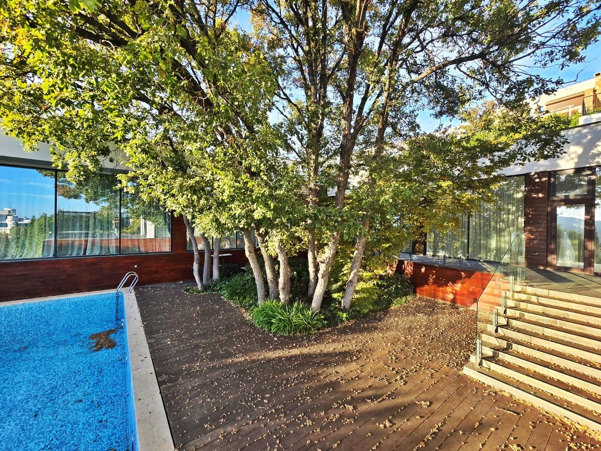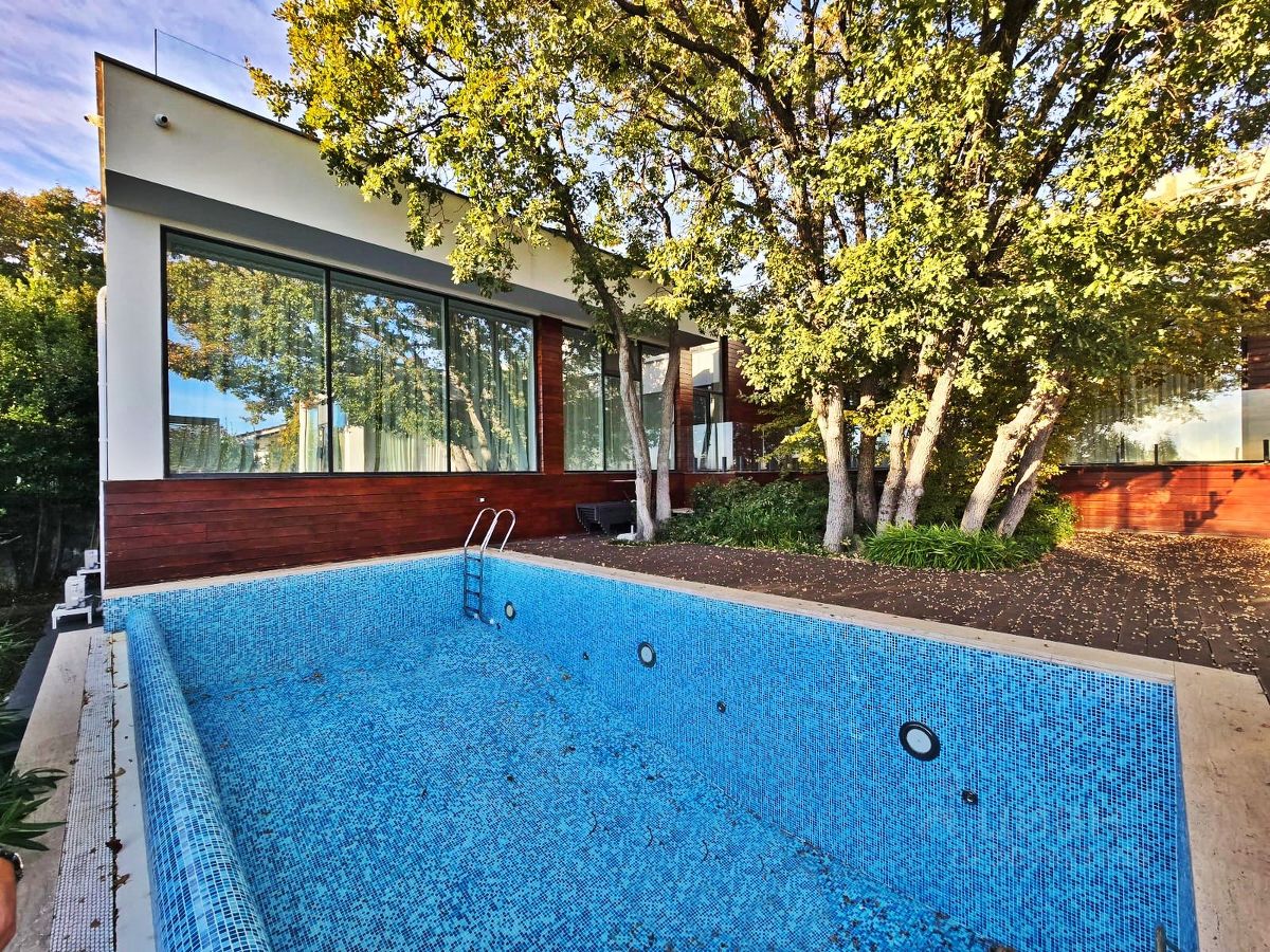 Коммуникации центральные: электричество, водоснабжение, газ, водоотведение. Технические характеристики: *Двухэтажный дом *Площадь: 703м² *Высота потолка: 3,5 м. *Ремонт: дизайнерский *Стиль: Среднеземноморский. *Отопление: газовый котёл, теплый пол. *Установлена система Умный дом. *Электричество: есть. *Водоснабжение: городское Планировка дома: Всего 2 этажа, 5 комнат *На 1 этаже расположены: -просторная и светлая кухня с панорамными окнами, -большая гостиная с выходом к бассейну, -мастер-спальня с гардеробной и санузлом, -зал с камином и выходом на террасу с бунгало, -2 санузла.