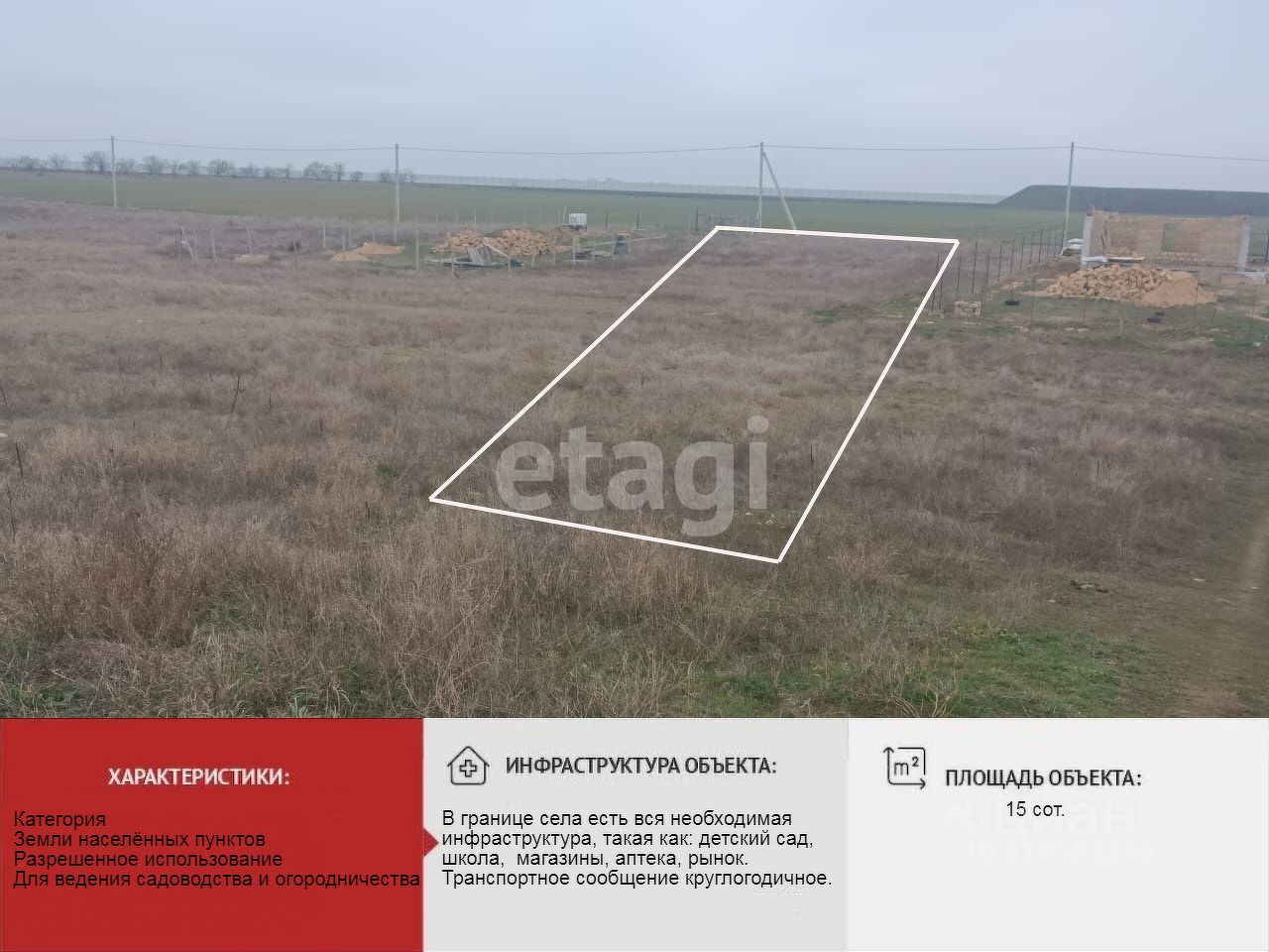 Участок ровной прямоугольной формы, находится в населенном пункте, не обработан, но сделано межевание. Электроснабжение, газ и вода проходят по границе земельного участка.