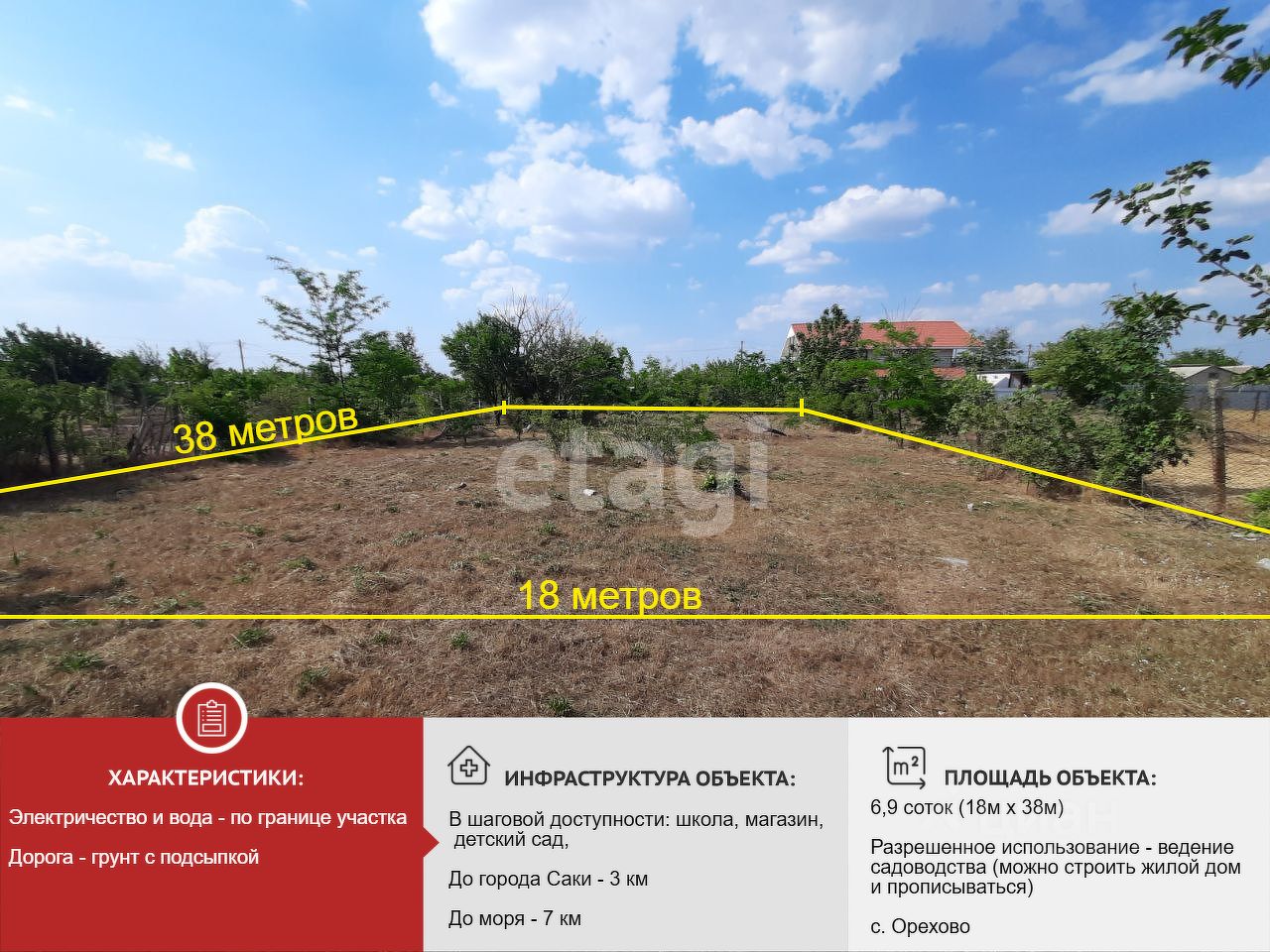 Площадь участка составляет 7 соток, что дает вам достаточно пространства для реализации всех ваших идей. Участок ровный, свободный от построек и огорожен сеткой рабицей. Коммуникации, такие как электричество и вода, проходят по границе участка, что значительно упрощает процесс подключения.