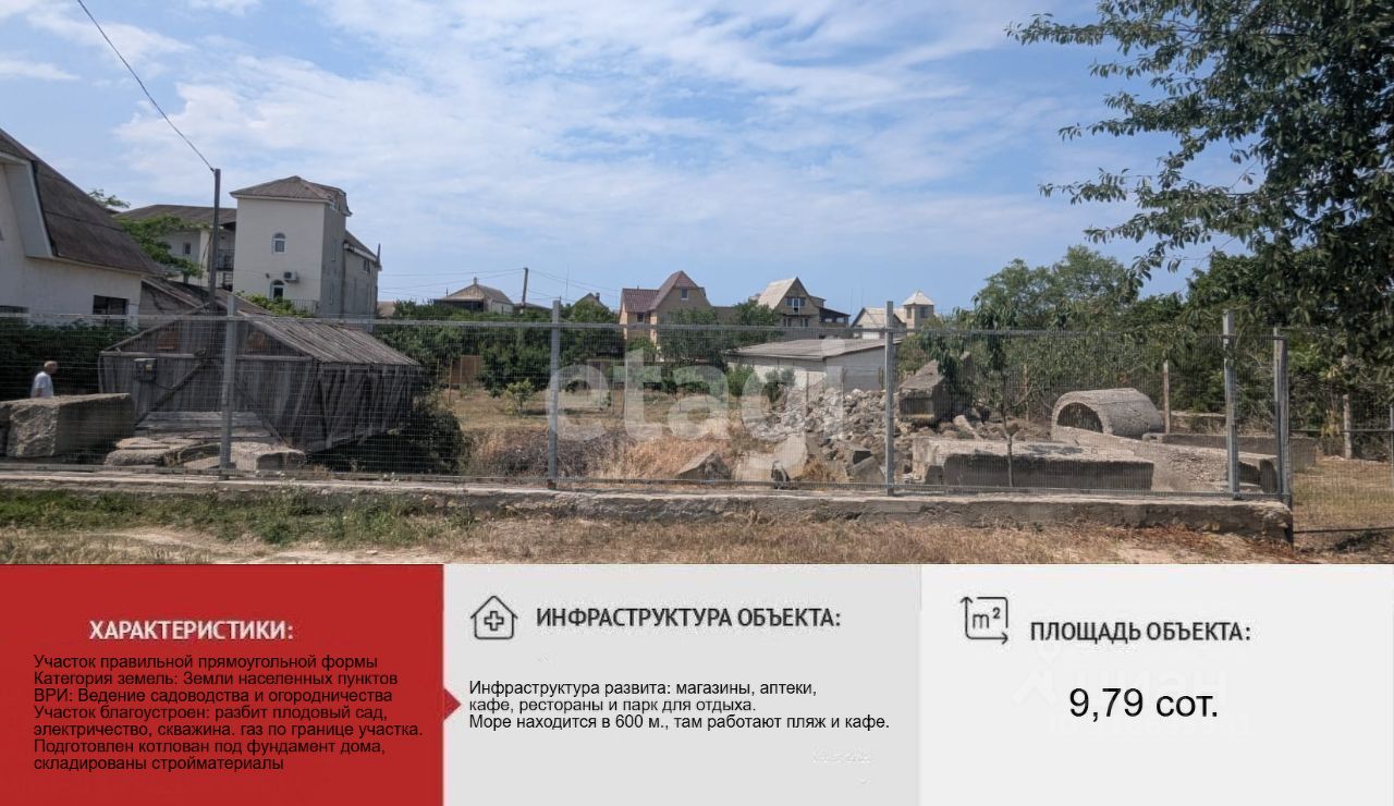 Полностью огорожен забором, есть вторая калитка, ведущая к тропинке к морю. Участок благоустроен: разбит плодовый сад с черешней, инжиром, виноградом и другими культурами, проведено электричество, обустроена скважина. По границе участка проходит газовая магистраль, что упрощает подключение. Подготовлен котлован под фундамент дома, складированы стройматериалы, что ускоряет начало строительства. Участок находится в жилой зоне, окружен соседними домами.