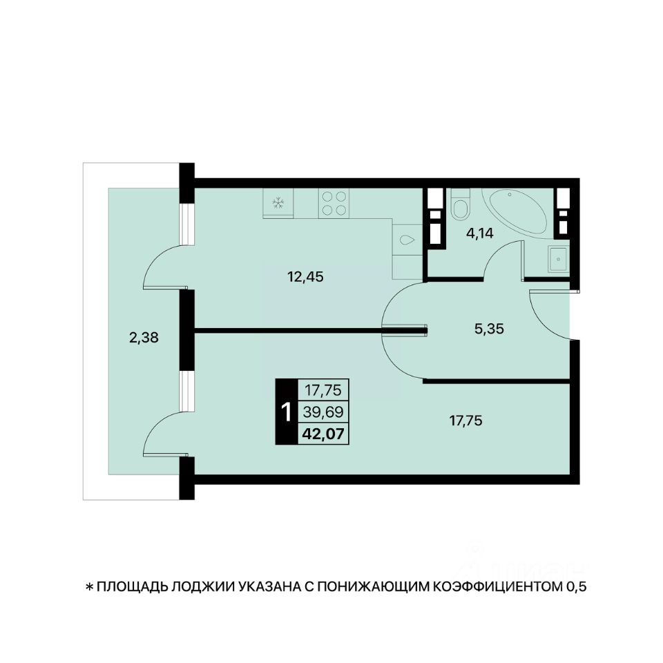 Общая площадь42,07 м2