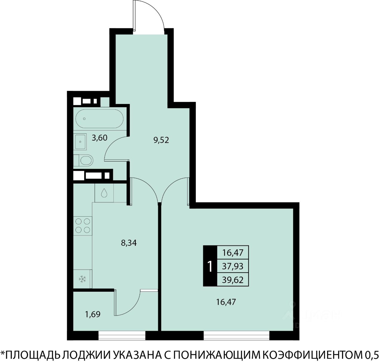 Общая площадь39,62 м2